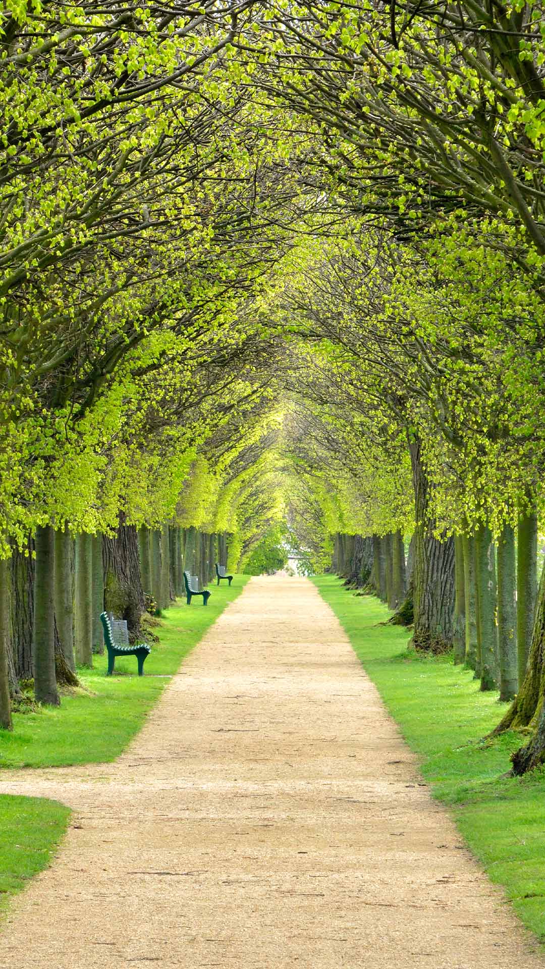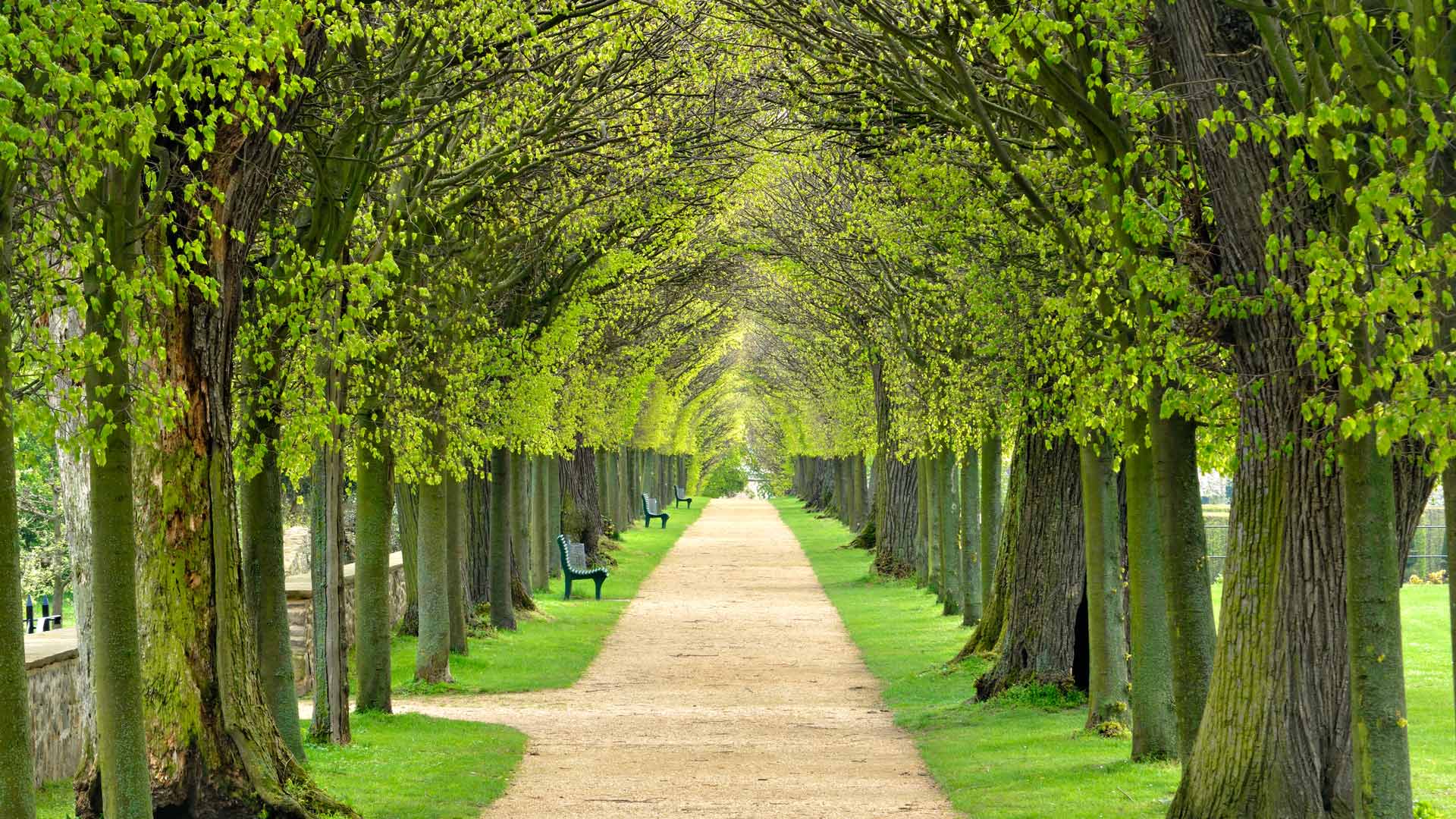 Lindenallee, baumgesäumter Fußweg durch den Park im Frühling