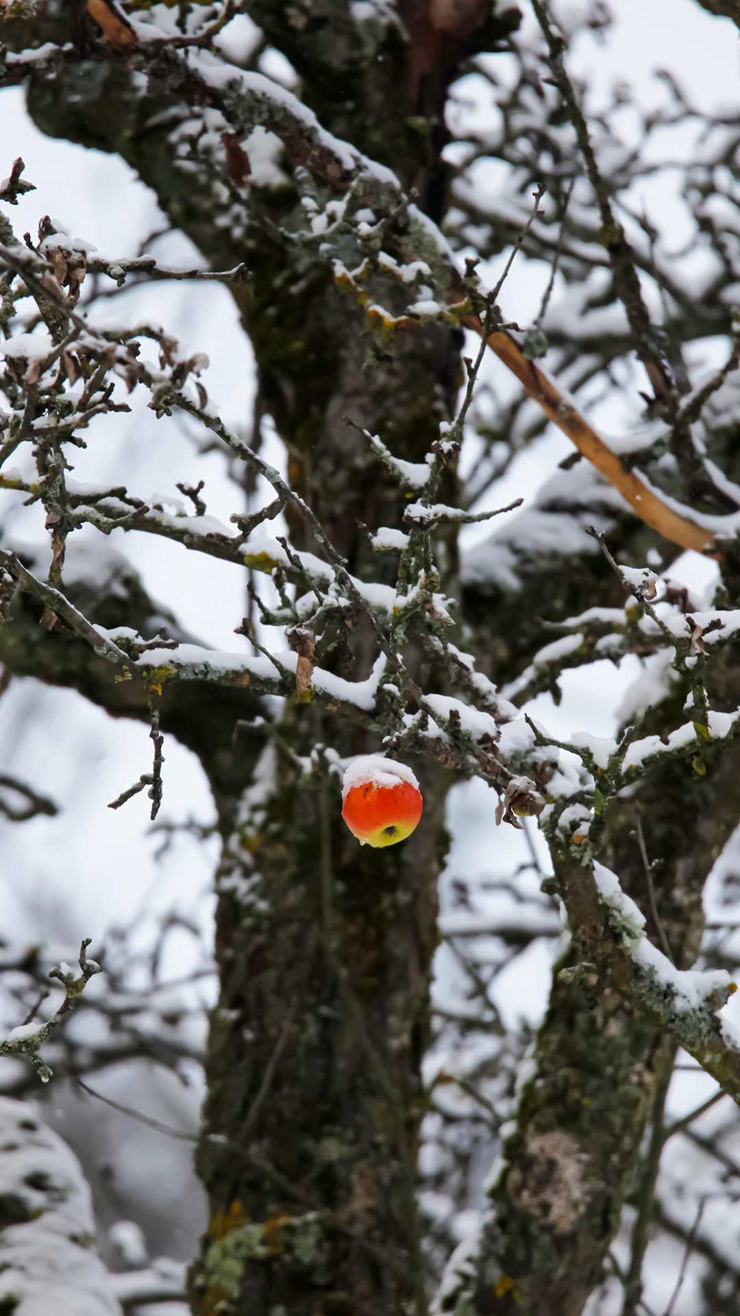 Apfel hängt an einem verschneiten Baum, Deutschland (© Westend61/Getty Images)
