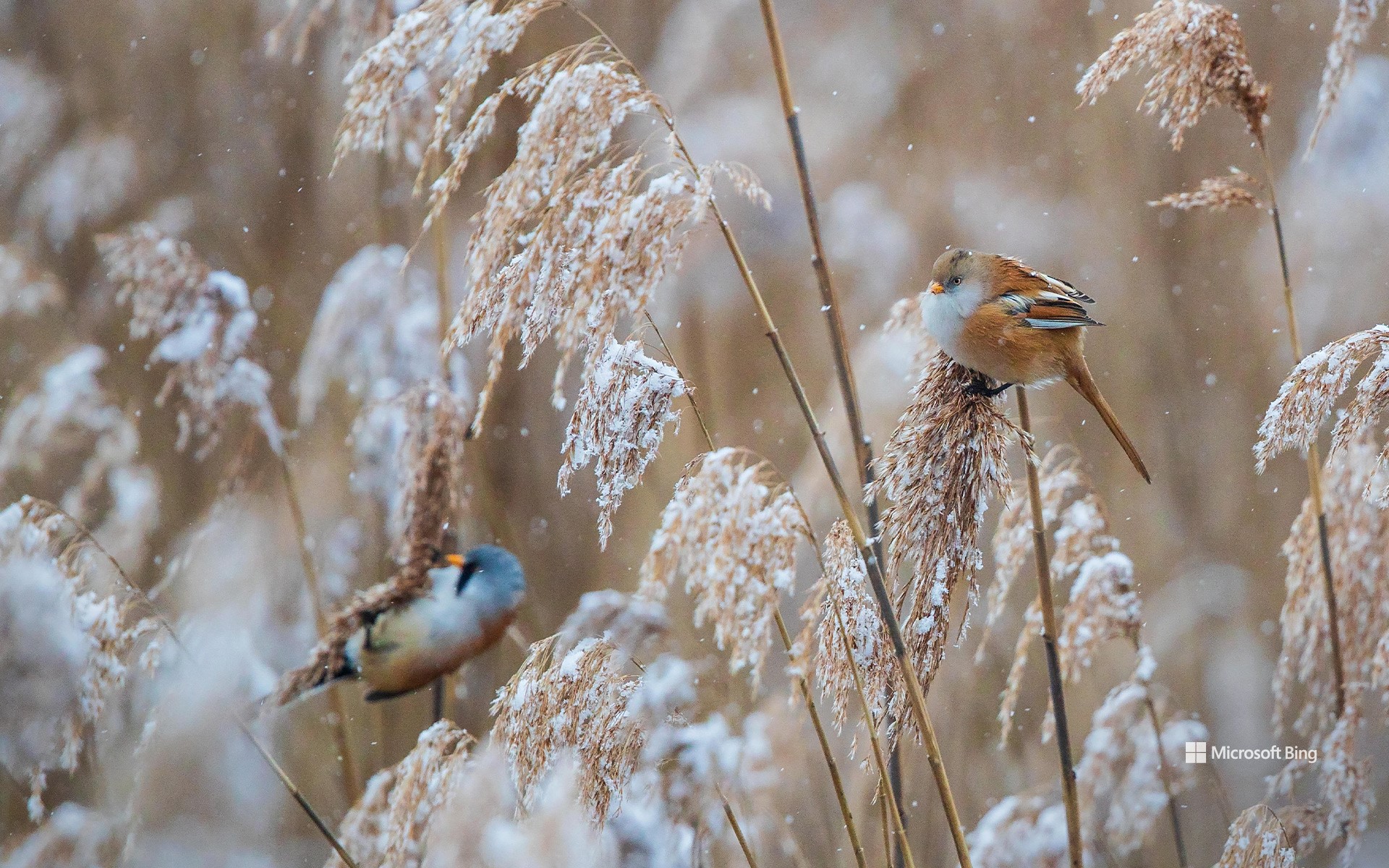 Bartmeisen (Panurus biarmicus) Männchen und Weibchen auf Nahrungssuche in verschneiten Schilfrohren, Baden-Wuerttemberg (© Martin Grimm/Alamy Stock Photo)