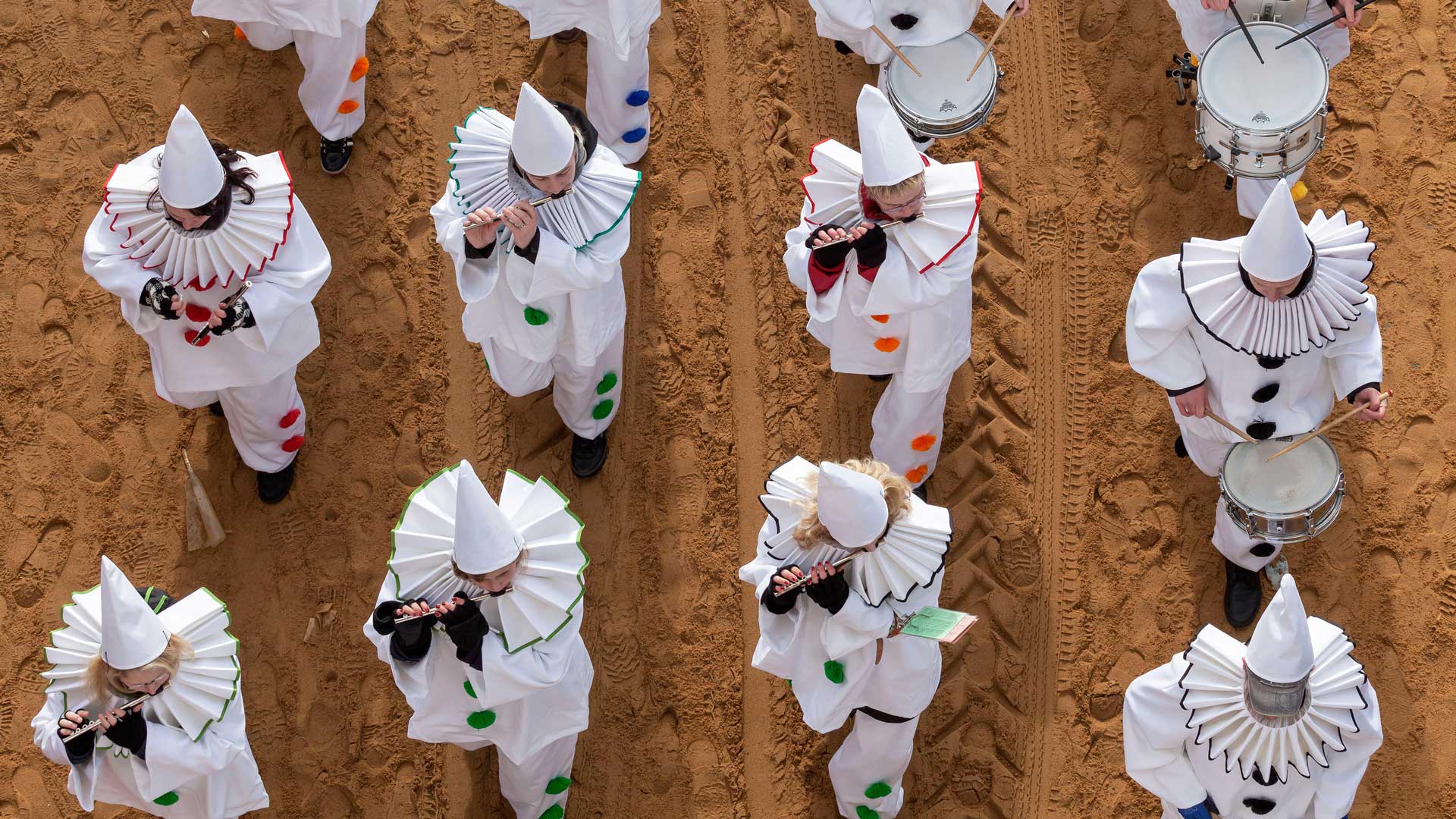 Auf dem heutigen Bild sind kostümierte Teilnehmer zu sehen, die in klassischer Clownskleidung mit Trommeln und Pfeifen den Takt vorgeben. Solche Musik- und Fußgruppen gehören seit jeher zum Rosenmontagszug und unterstreichen die Vielfalt der Figuren und Kostüme, die Kölns Straßen während der „tollen Tage“ beleben.