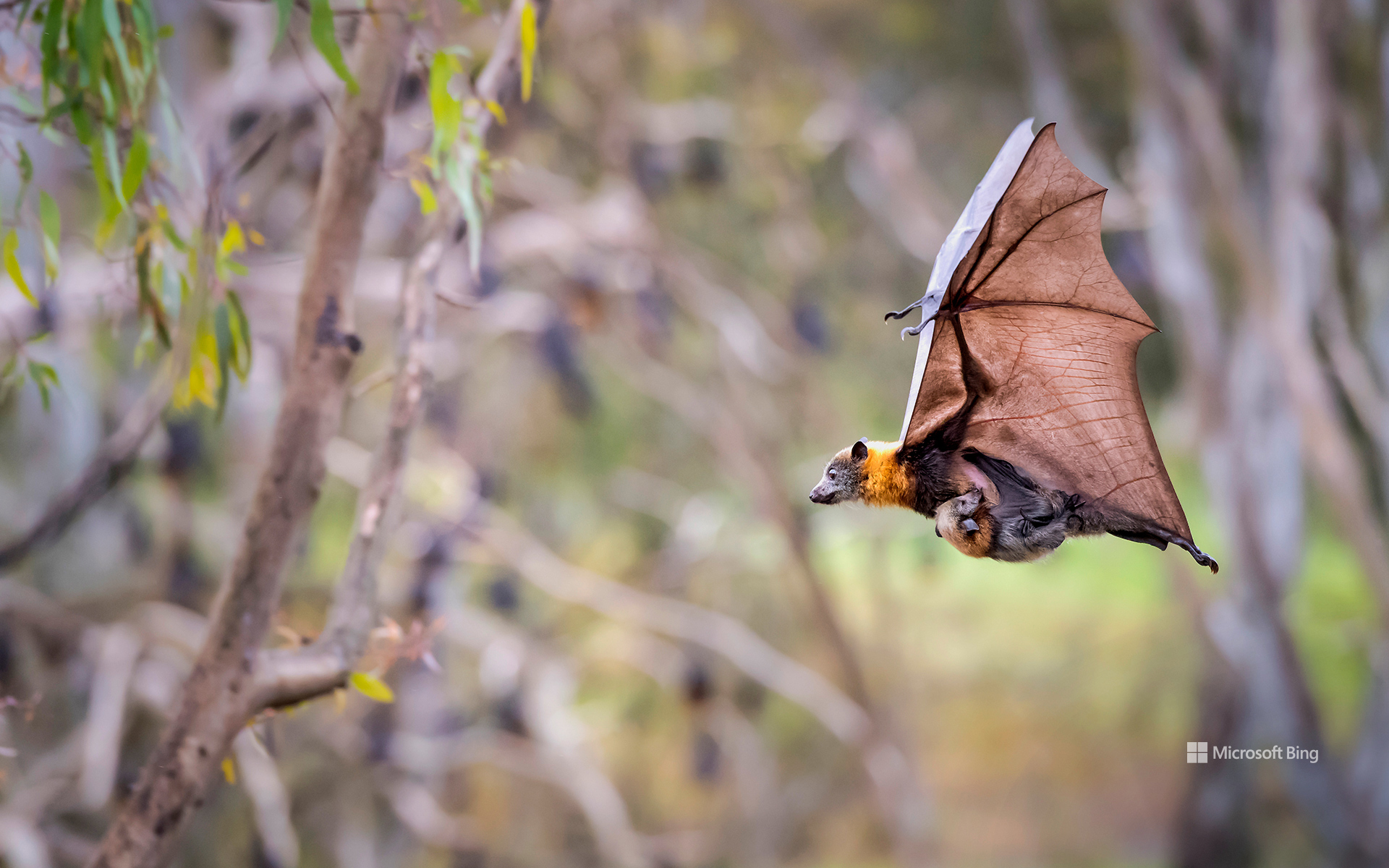 Hoch oben in den Baumwipfeln klammert sich ein Jungtier fest an den Bauch seiner Mutter. Der Graukopf‑Flughund gehört zu den größten Vertretern der Fledertiere und ist in Australien heimisch. Obwohl er mit Fledermäusen verwandt ist, unterscheidet er sich deutlich von ihnen. Flughunde zählen zu einer eigenen Gruppe innerhalb der Fledertiere und nutzen in der Regel keine Echoortung. Stattdessen orientieren sie sich mithilfe ihres ausgeprägten Seh‑ und Geruchssinns, was eine Anpassung an ihre überwiegend pflanzliche Ernährung darstellt.