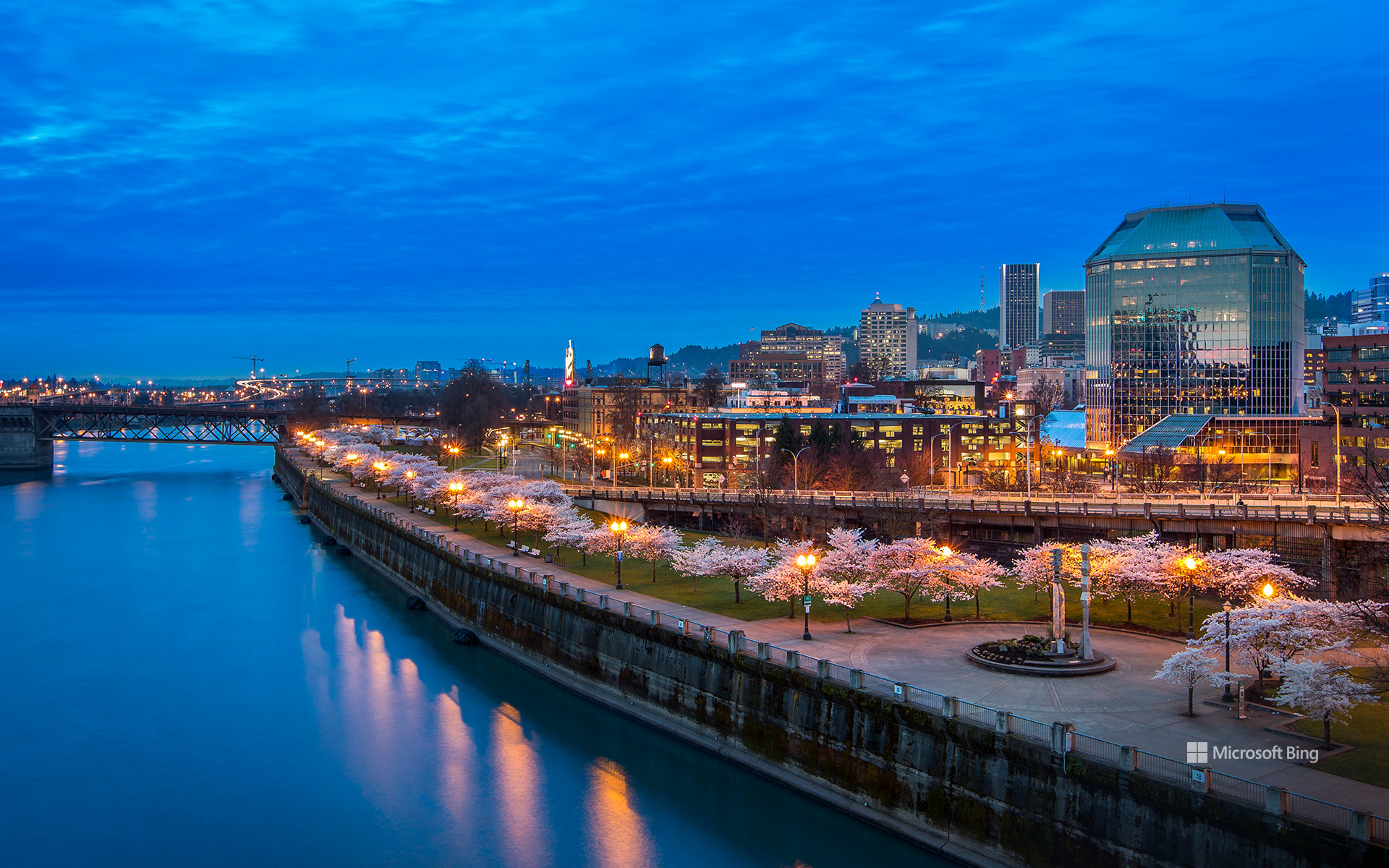 Tom McCall Waterfront Park, a 12.5-hectare urban oasis along the Willamette River in Portland, Oregon, is one of the city's most beloved green spaces. Each spring—typically from mid-March to early April—it transforms into a sea of soft pink and white as cherry blossoms bloom. These vibrant trees along scenic walking paths offer a peaceful escape in the heart of the city. The park also features notable landmarks like Salmon Street Springs, an interactive fountain with numerous water jets, and the Portland Saturday Market, a favourite local destination.