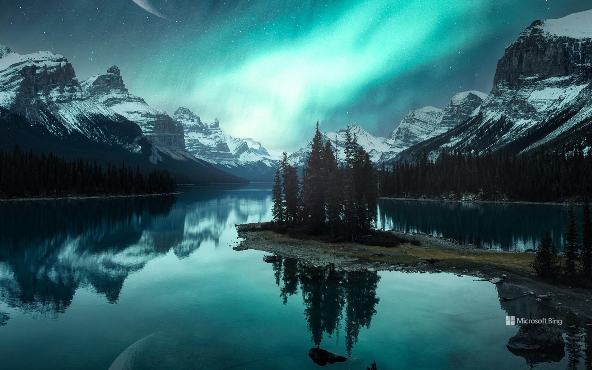 Aurora over Spirit Island on Maligne Lake, Jasper National Park, Alberta, Canada