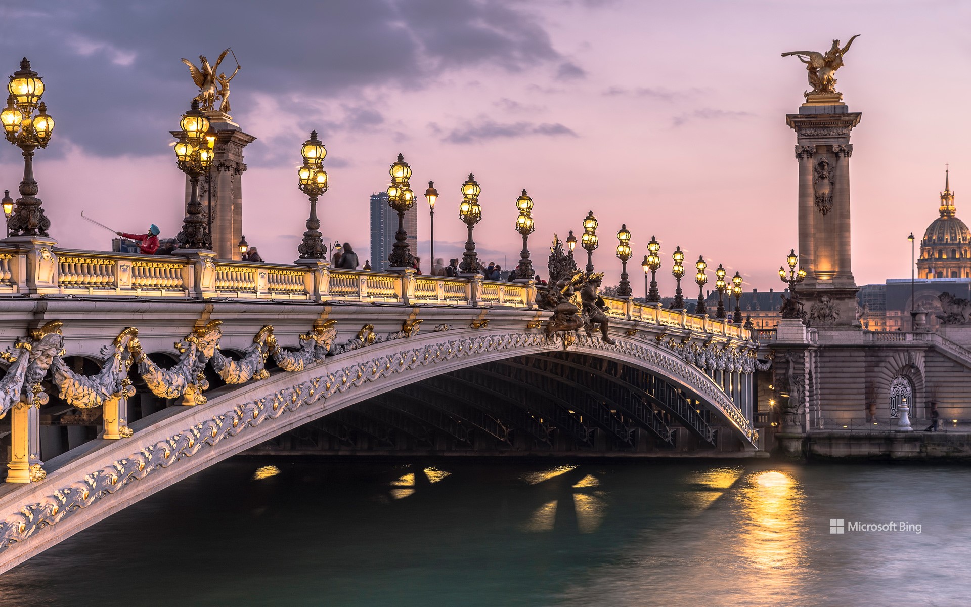 Bonjour! Waking up in Paris sounds royal, doesn't it? Peek through your screen today at the Pont Alexandre III in the magic hour of twilight. Arching over the Seine, the bridge was opened in 1900 and named after the Russian tsar, Alexander III, to commemorate the Franco-Russian Alliance signed in 1891. Befitting the nobility of the event, two 17-metre pylons sit upon each bank of the river, crowned with gilt-bronze sculptures of the winged horse Pegasus. And that's only at the start of the bridge! From the centre of the bridge, standing above reliefs decorated with nymphs, you can admire the romantic garden and monument of the Esplanade des Invalides on one side of the river and the Grand Palais and Petit Palais museums on the other.