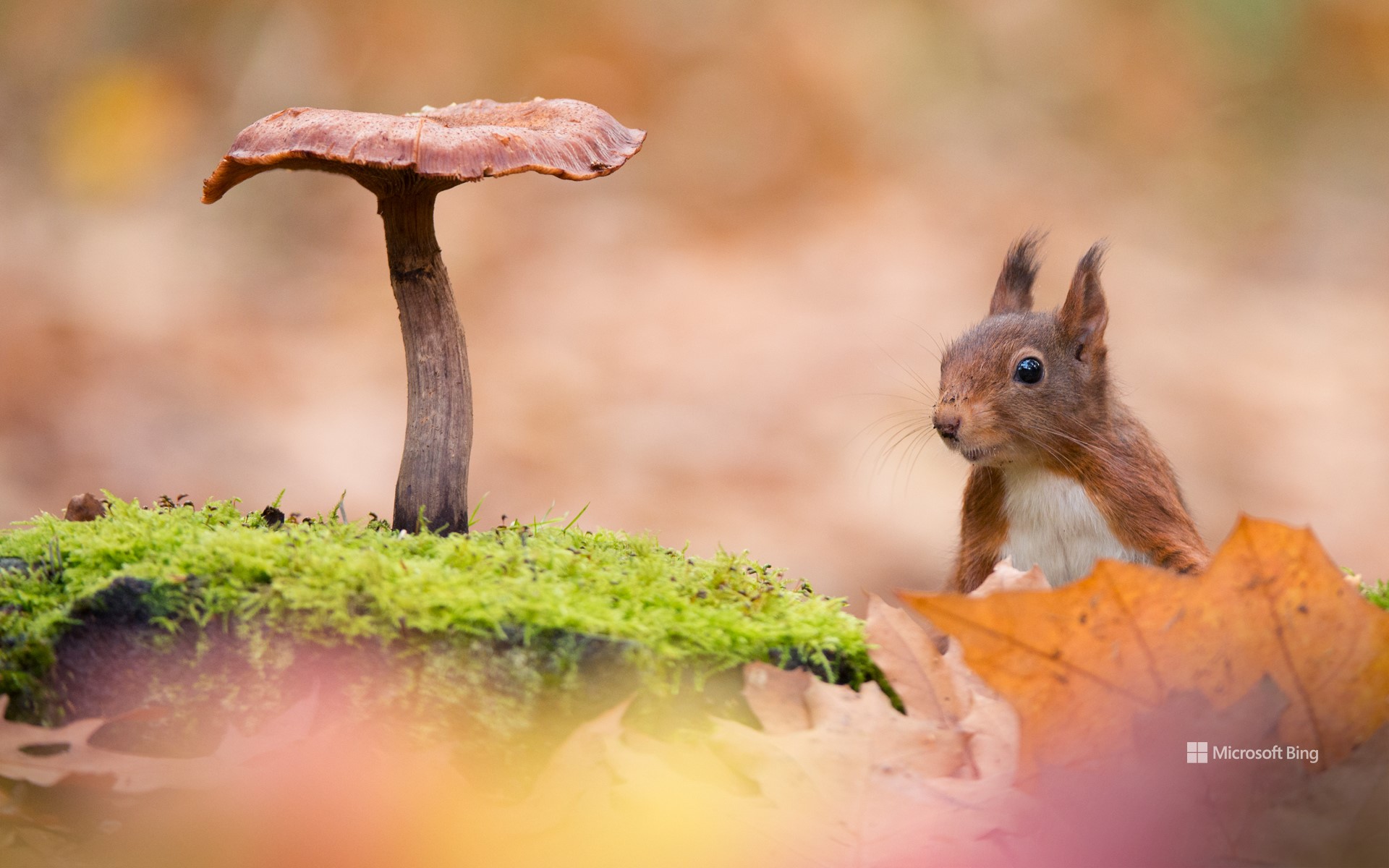 Eurasian red squirrel with toadstool (© Edwin Giesbers/Minden Pictures)