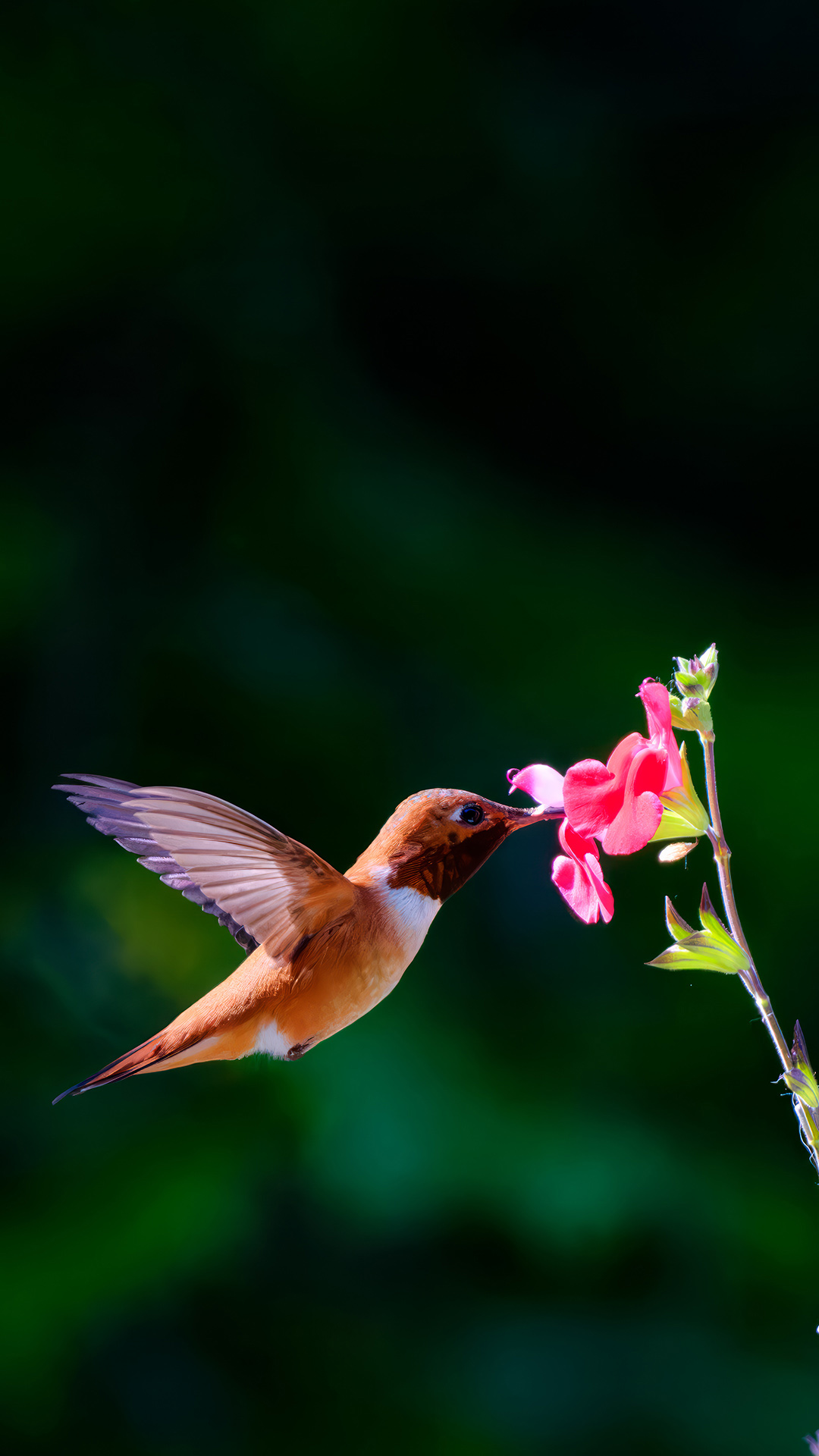 Blink, and you miss them. Rufous hummingbirds don't just fly—they dart, hover and zip through gardens like tiny, feathered rockets. They migrate thousands of kilometres from Mexico to the Pacific Northwest, making one of the longest migratory journeys relative to body size. The males arrive first, flashing their signature coppery-orange feathers to claim territory. They perform dramatic aerial dives to impress potential mates, reaching speeds of nearly 80 kilometres per hour. With wings beating up to 42 to 62 times per second based on gender, they burn energy fast, making frequent pit stops at flowers and feeders to fuel up. Once the display is over, the female gets to work, building a soft, camouflaged nest in trees or shrubs, where she raises the tiny chicks on her own.