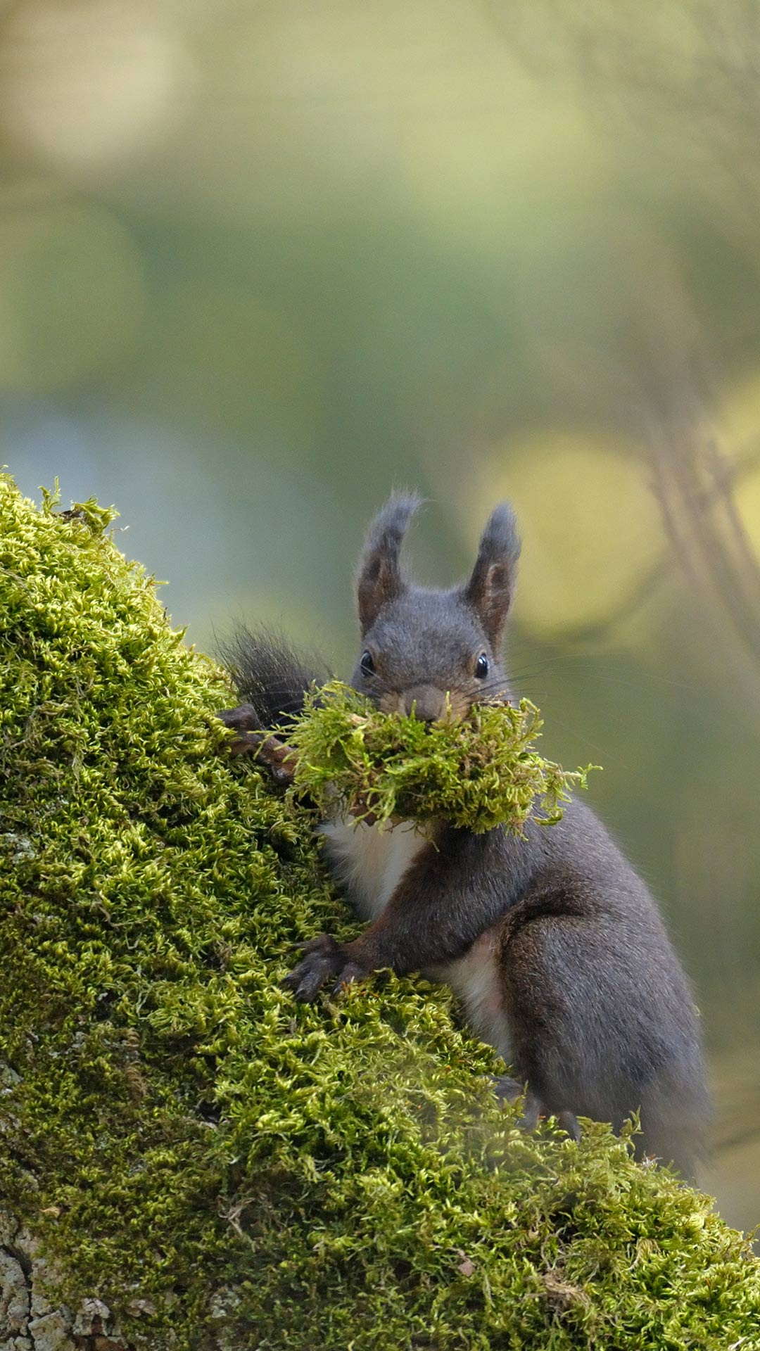 Quick, clever and always on the move—meet the Eurasian red squirrel, a leafy treetop resident found across much of Europe and Asia. While it prefers the shelter of forests, this agile creature easily adapts to gardens and parks. It builds its nest, called a drey, high in the fork of a tree using twigs to form a domed structure about 25 to 30 centimetres wide. The female featured here is gathering moss—one of several soft materials, along with bark, leaves and grass, that line the nest and turn it into a snug, well-insulated retreat. These rodents may also take over tree hollows or abandoned woodpecker holes when available.