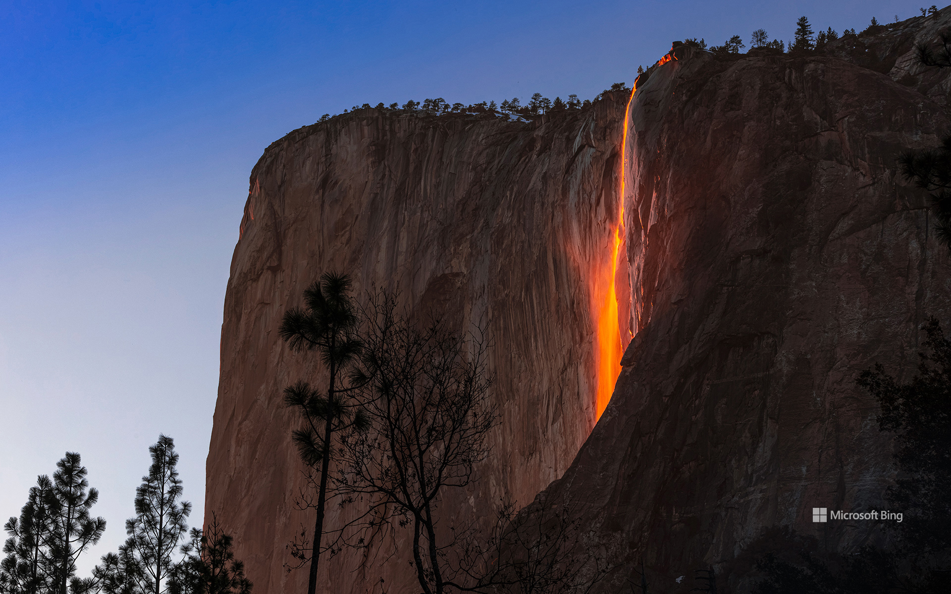 Far more mysterious is the natural Firefall at Horsetail Fall on El Capitan. On a few evenings in mid- to late February, the sunset hits the waterfall at just the right angle, turning it bright orange, as if molten lava were sliding down the mountain. Clear skies, sufficient water and perfect timing are all essential for this effect to occur. In 1973, Galen Rowell observed this rare phenomenon and took the first widely known photograph of the natural Firefall—bringing widespread attention to one of Yosemite's most remarkable sights.