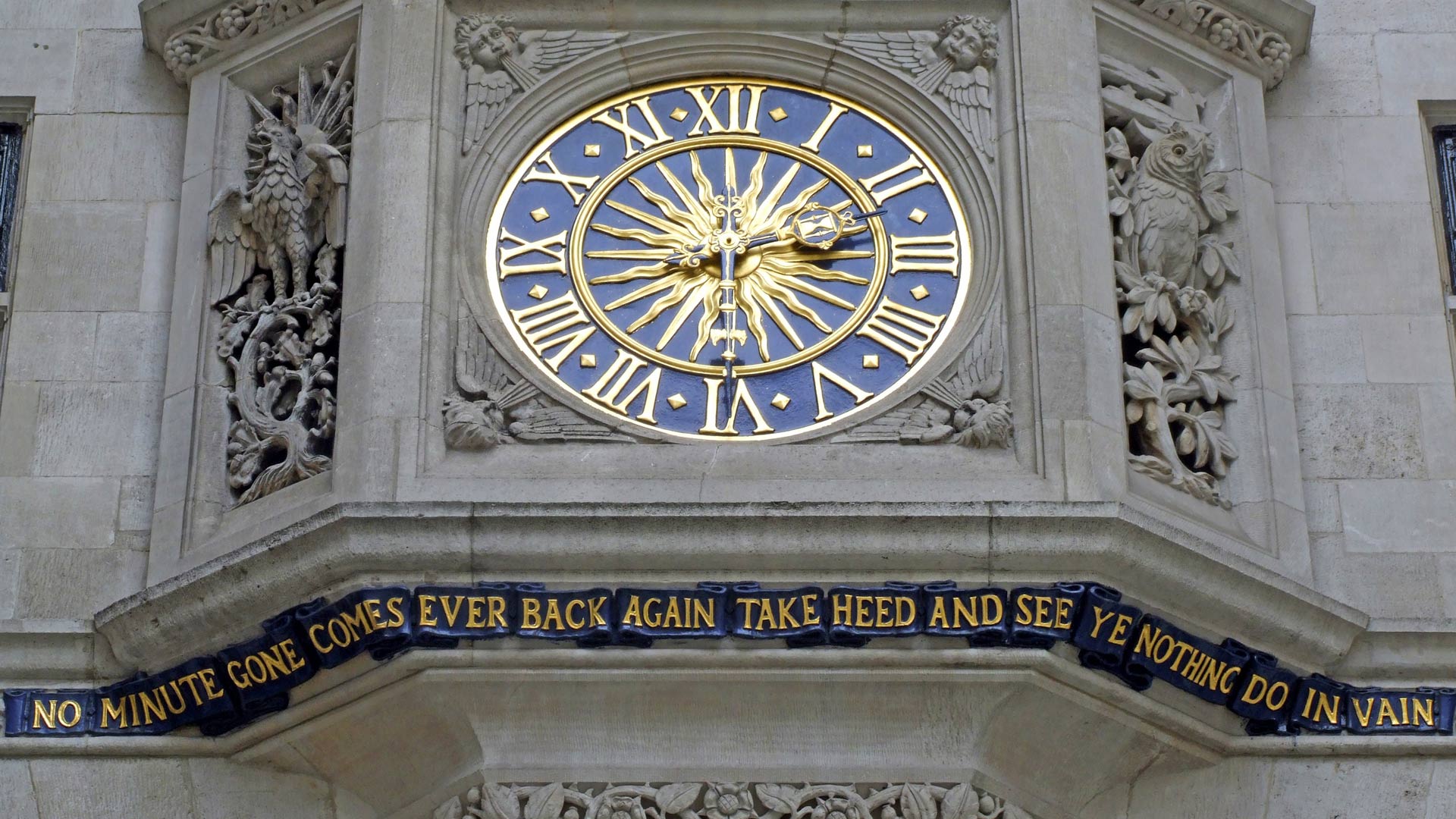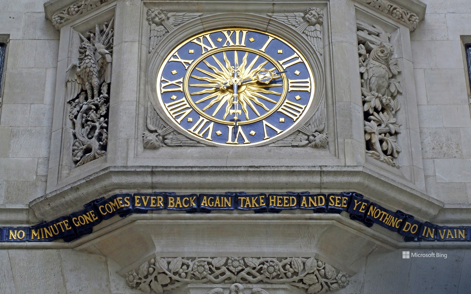 Today's image comes from Soho, London. The Tudor-style façade of Liberty features a clock beneath which shoppers can read: 'No minute gone comes ever back again, take heed and see ye nothing do in vain.'