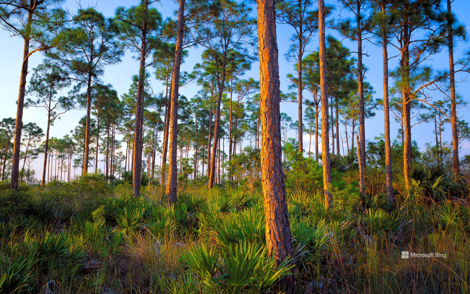 Seen here, sunlit slash pines and saw palmetto create open woodlands that contrast sharply with the Everglades' vast wetlands and mangrove forests. These higher, drier areas support plant and animal communities that cannot survive in flooded conditions. The park also shelters a wide range of wildlife, from American alligators to elusive Florida panthers, along with hundreds of bird species. It is one of the few places in the world where alligators and crocodiles coexist, reflecting the overlap of freshwater and coastal environments. Ongoing conservation efforts aim to restore natural water flow, which remains essential to the park's survival.