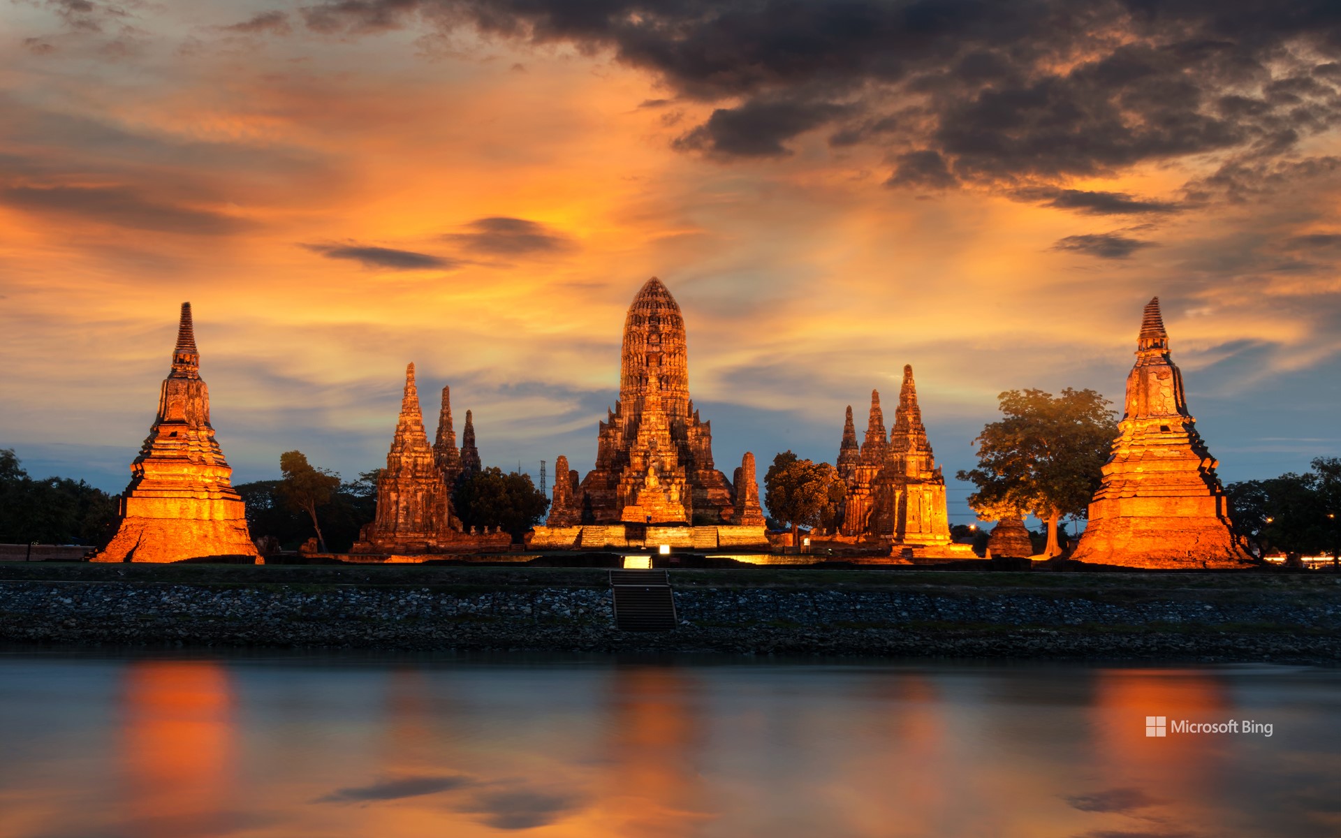 When the sun sets over Thailand, the Wat Chaiwatthanaram Buddhist temple lights up to welcome the night at the Ayutthaya Historical Park. These ruins are evidence of the area's rich history as the capital of the Ayutthaya Kingdom, which grew in power between the 14th and 18th centuries to rule Siam, or present-day Thailand. Around 1630, Wat Chaiwatthanaram was built on the orders of the dynasty's King Prasat Thong, to symbolize the center of the universe and connote his aspiration to become the future Buddha.