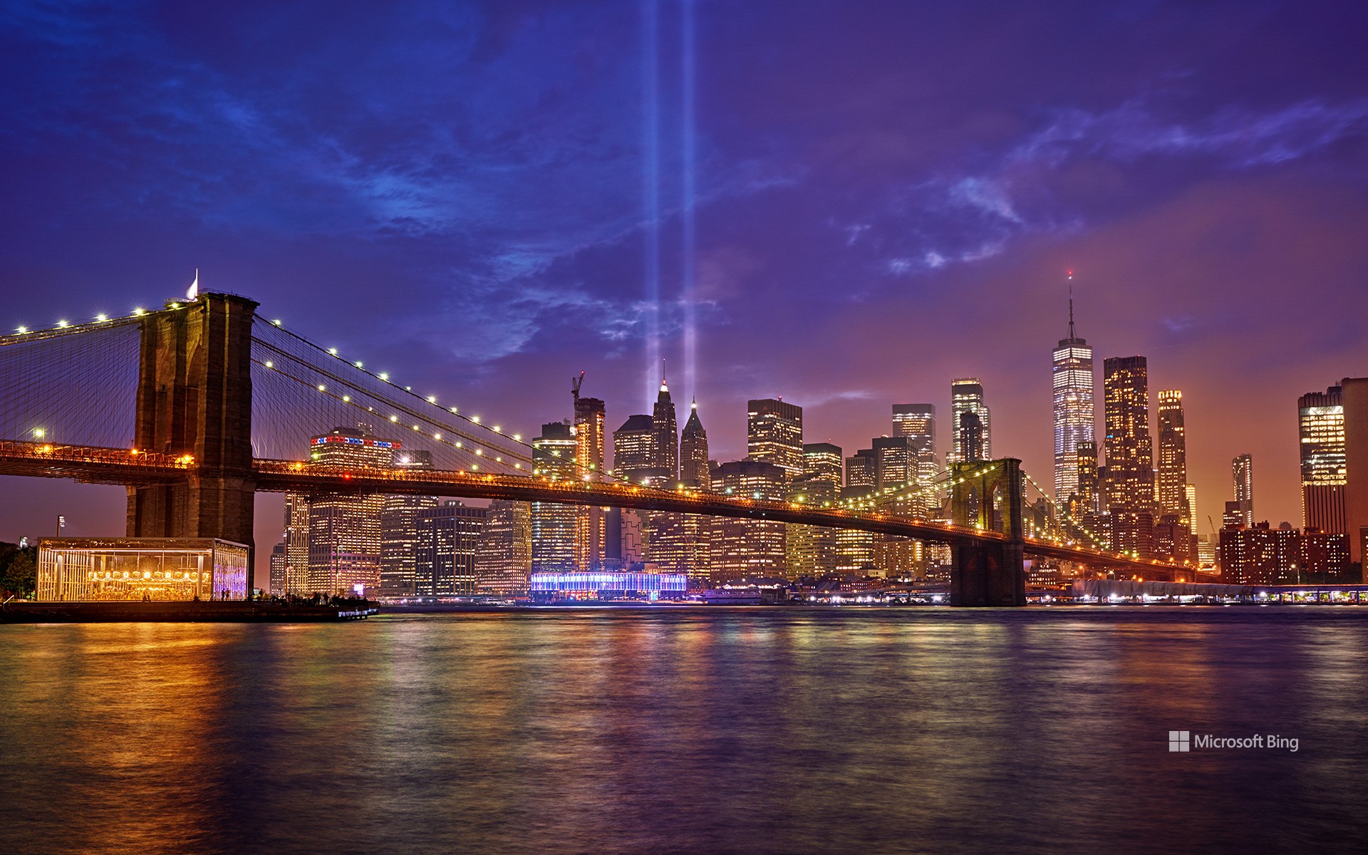 Today's image is of the Brooklyn Bridge with 'Tribute in Light' in the background, a display of 88 searchlights arranged in two columns that represent the Twin Towers that fell. Originally a temporary display, the annual installation illuminates the sky with columns of light from dusk until dawn. It is a stark reminder of the lives that were tragically lost in Manhattan, Pennsylvania, and at the Pentagon.