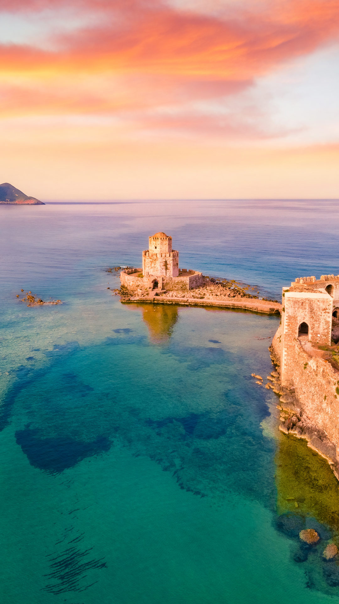 Perched on a rocky headland is Methoni Castle, a symbol of medieval might on the shores of the Ionian Sea. The fortress, on the Peloponnese peninsula in southern Greece, was built by the Venetians in the early 13th century as a trading post and defensive bastion, protecting the coastline from invaders. Its Bourtzi tower, an extension of the fortress standing on a small islet, was once connected to the main castle by a stone bridge.