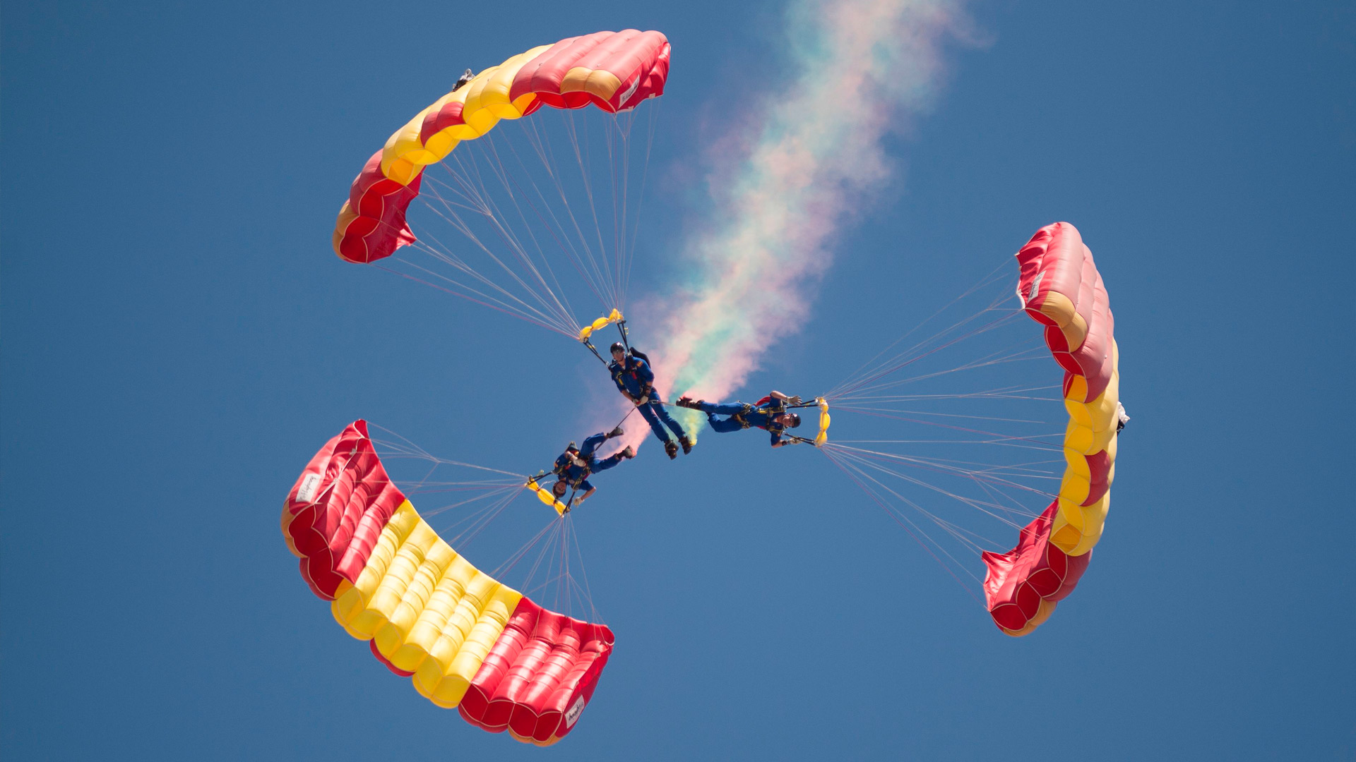 En diversos puntos de nuestro país se realizan actos conmemorativos, entre ellos desfiles y exhibiciones militares como la que vemos en nuestra imagen de hoy, donde podemos disfrutar de la Patrulla Acrobática Paracaidista del Ejército del Aire, a estos eventos asisten las autoridades del país, destacando las figuras de la Casa Real, el presidente del Gobierno y altos cargos del Estado.