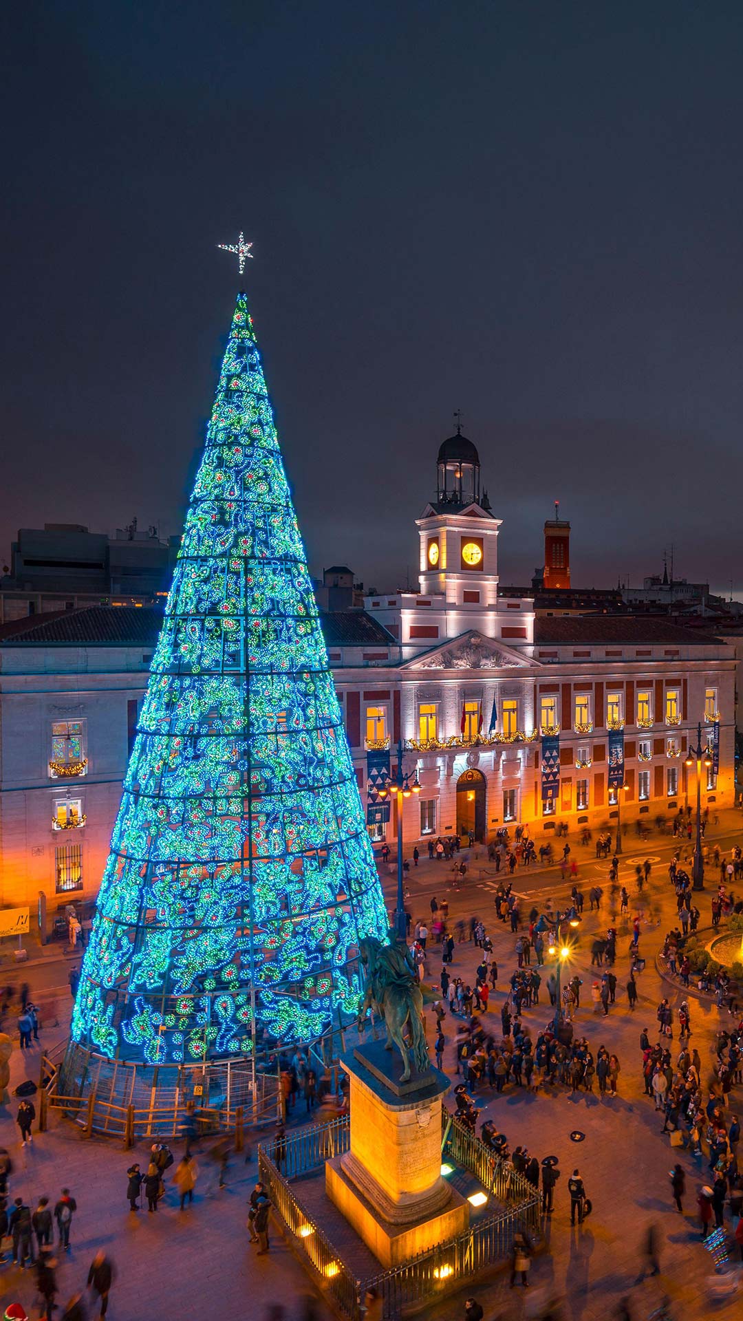 Con uvas en mano, o alguna golosina, cumplen el ritual de comerse una por cada campanada, invocando la suerte para los meses venideros. La alegre multitud, bajo el resplandeciente árbol de Navidad decorado con luces azules y los edificios iluminados, se convierte en un mar de esperanzas y deseos. Es un instante mágico donde el reloj de la Real Casa de Correos se convierte en el protagonista y las risas y abrazos se entrelazan con los fuegos artificiales que iluminan el cielo madrileño. La Puerta del Sol es más que un punto de encuentro, es el corazón donde late el espíritu festivo y unificador de toda España al son de la esperanza de año nuevo.