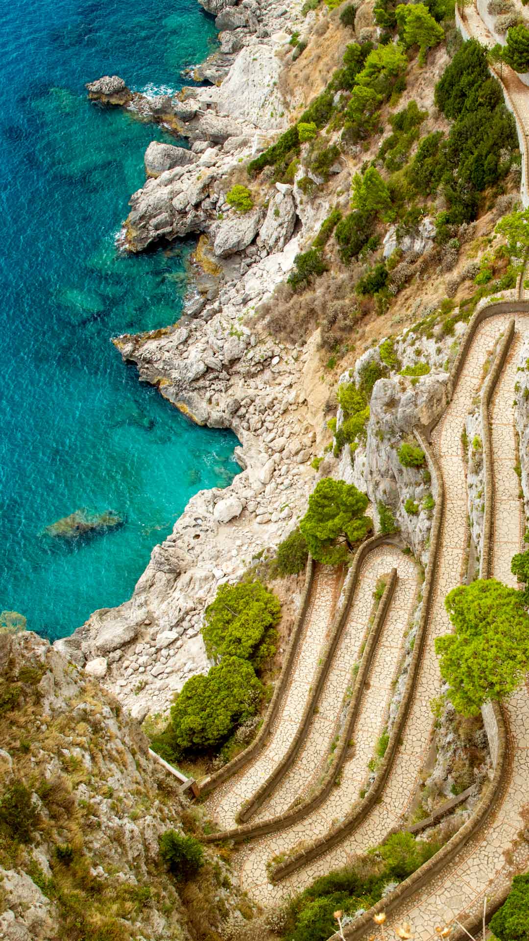 この 180 度に蛇行してゆく小道はクルップ通り。 1900 年から 1902 年にかけて、ドイツの実業家であるフリードリヒ・アルフレート・クルップがエンジニアに設計と建設を依頼して作らせた坂道で、カプリ島の町とビーチを結んでいます。急カーブと急勾配が複雑に絡み合うこの歩道は、当時としては驚異的な技術でした…