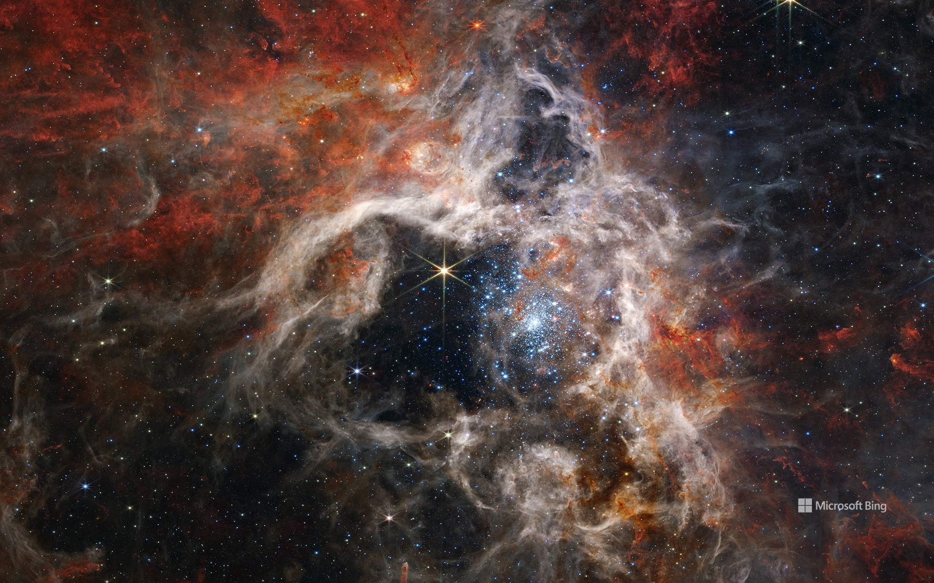 画像は NASA のジェイムズ・ウェッブ宇宙望遠鏡によって撮影されたタランチュラ星雲です。大マゼラン雲という銀河の中にある輝線星雲で、その中心部には、太陽の 150 倍もの質量を持つ巨大な恒星がたくさん集まっています。その光り輝く美しさと科学的興味深さから注目を集めています。