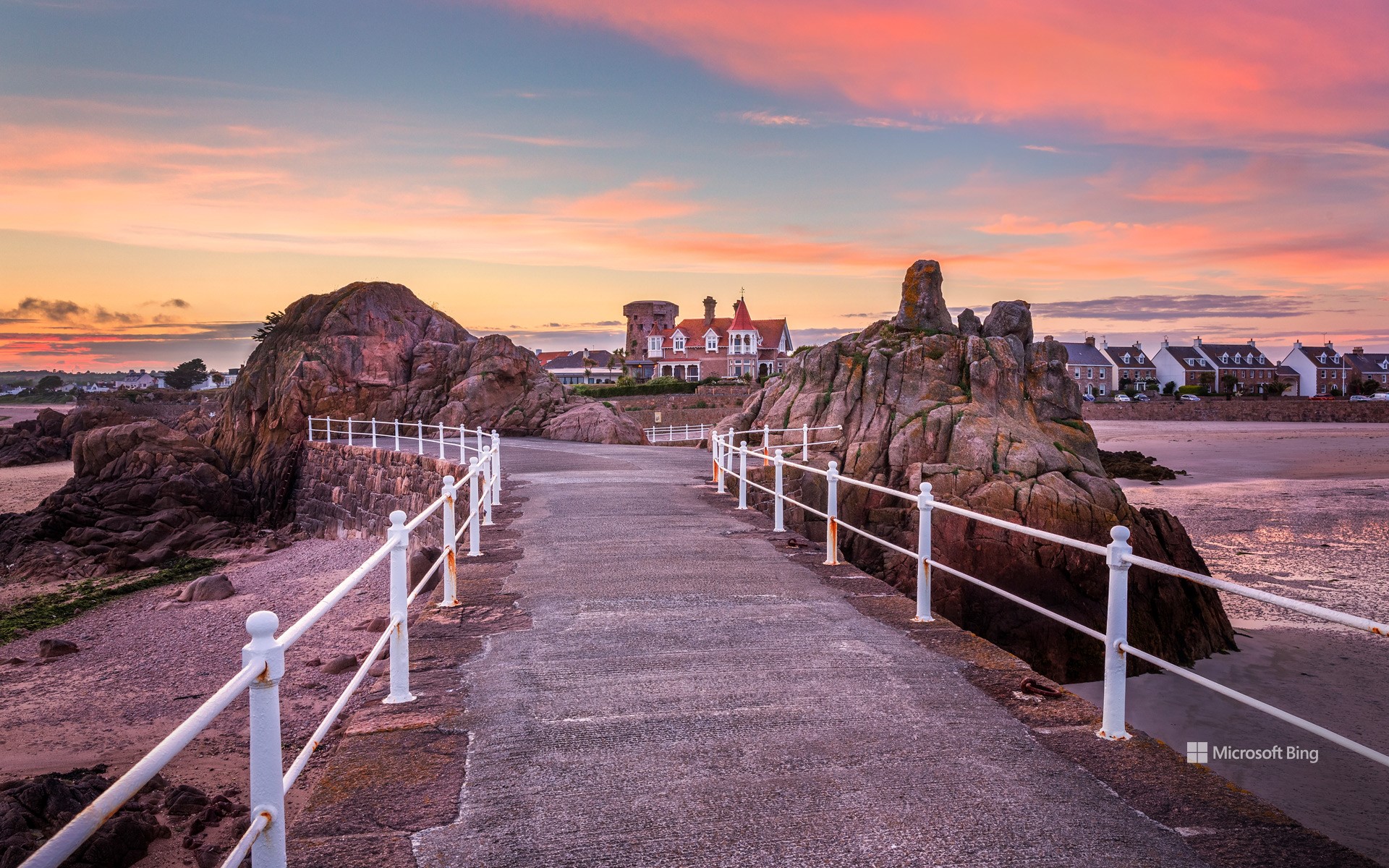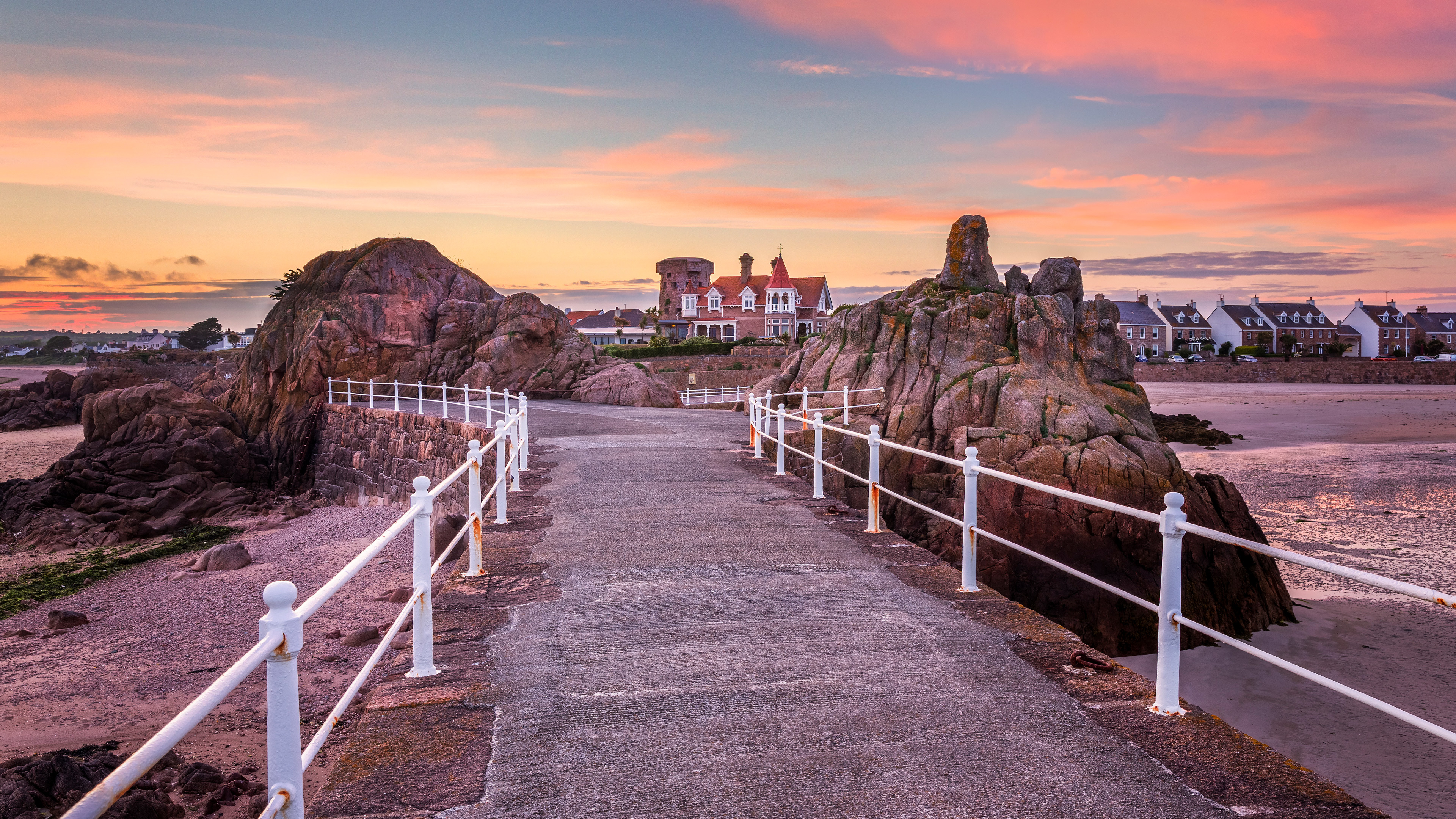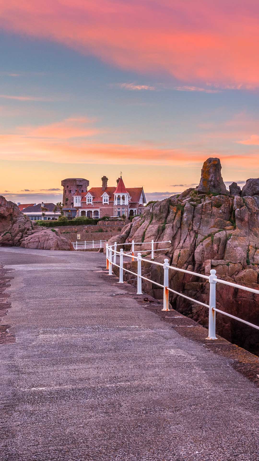 ここはイギリスのジャージー島の南東岸にある小さな漁港、ラ・ロック港です。白い砂浜が青い海へと広がり、絶景を作り出しています。海岸から少し離れたところに、海岸防衛のために建設された古いタワーがそびえ立ち、漁港の歴史を物語っています…