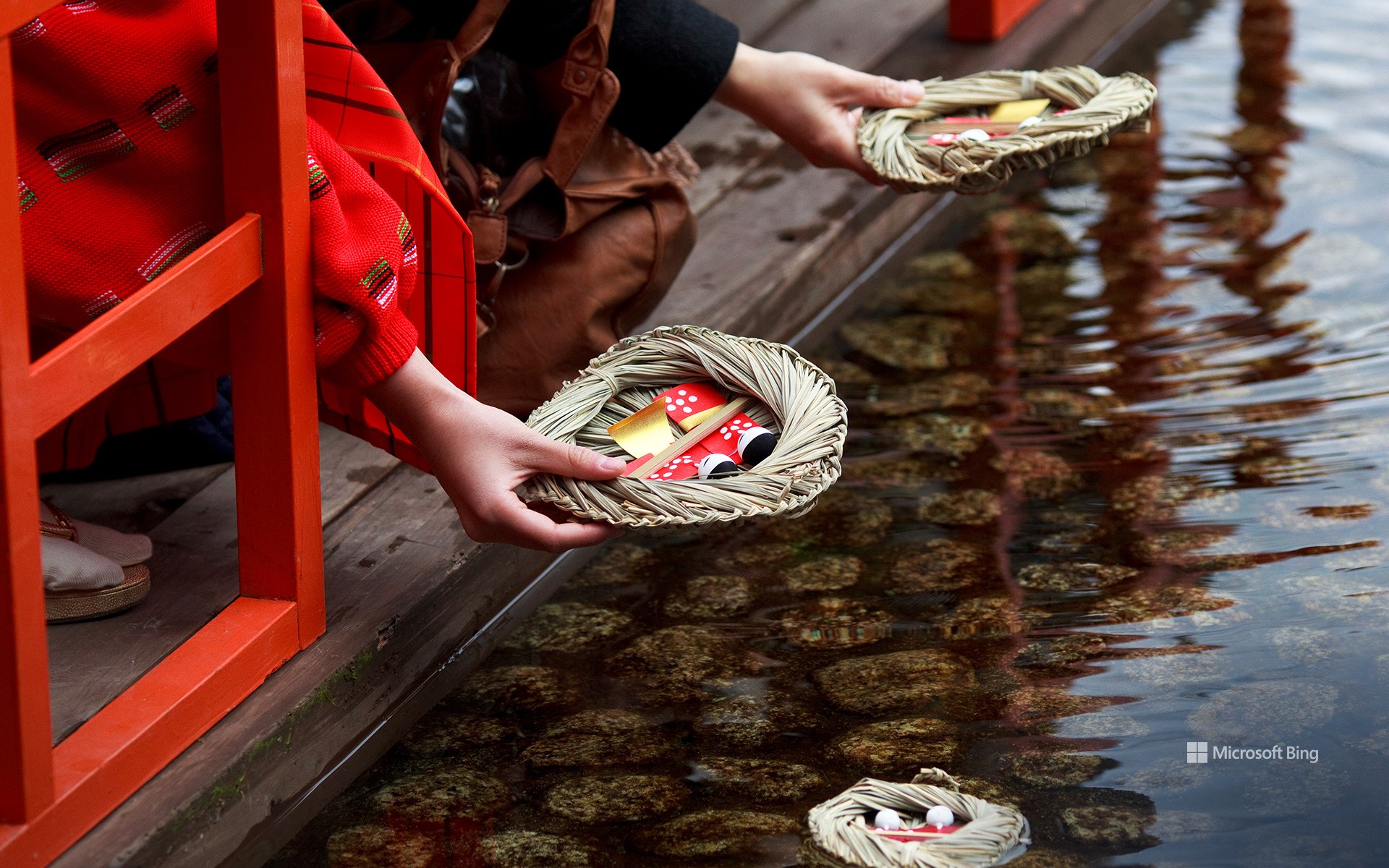この伝統的な行事は現在でも京都の下鴨神社で行われています。この日、お雛様とお内裏様に扮した男女が、和紙で作った雛人形を桟俵に乗せて下鴨神社の御手洗川に流します。その後、一般の参加者も桟俵を購入して川に流すことができます。