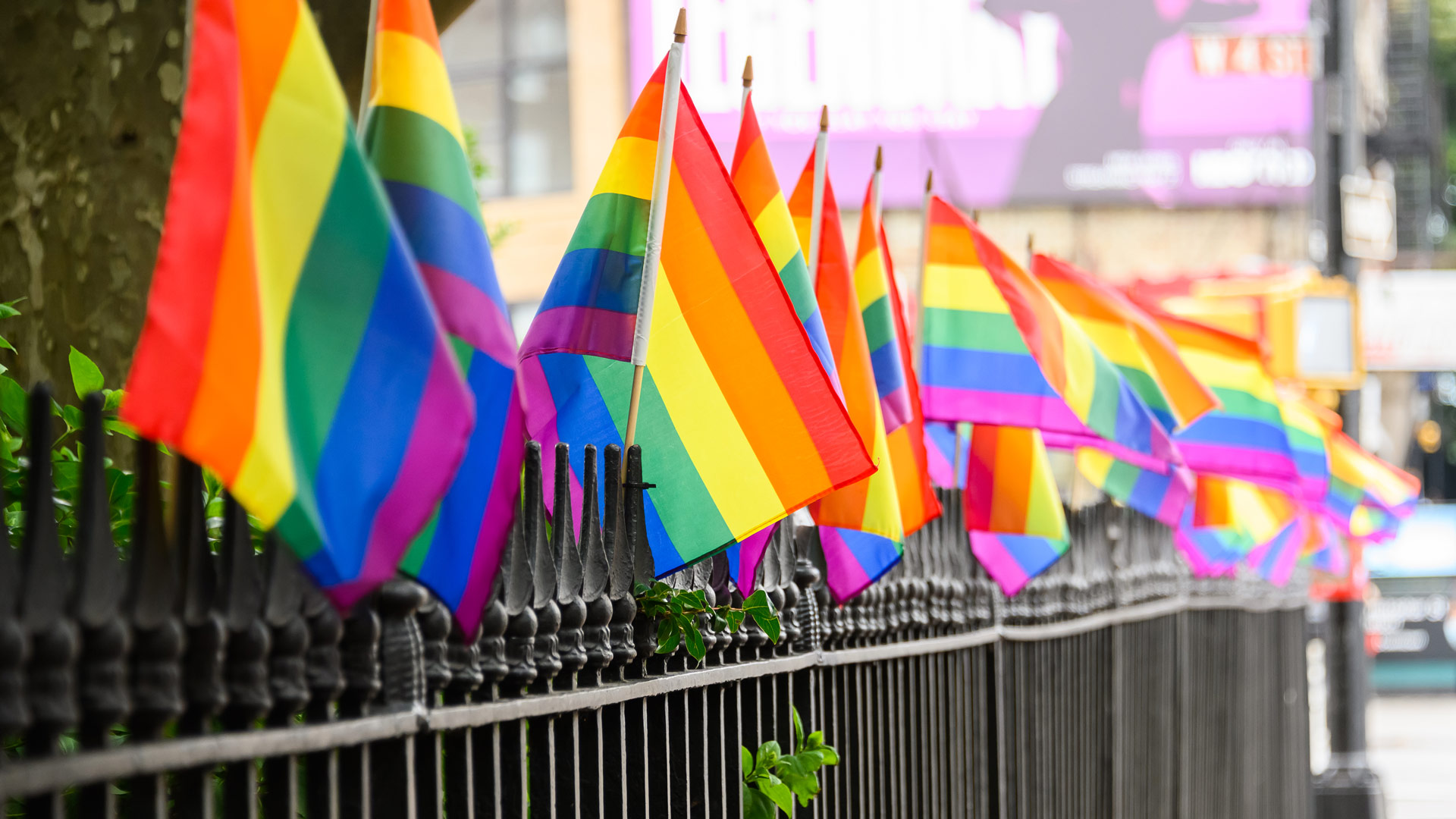 クリストファー・パークに掲げられたプライドフラッグ, 米国 ニューヨーク州 (© Noam Galai/Getty Images)