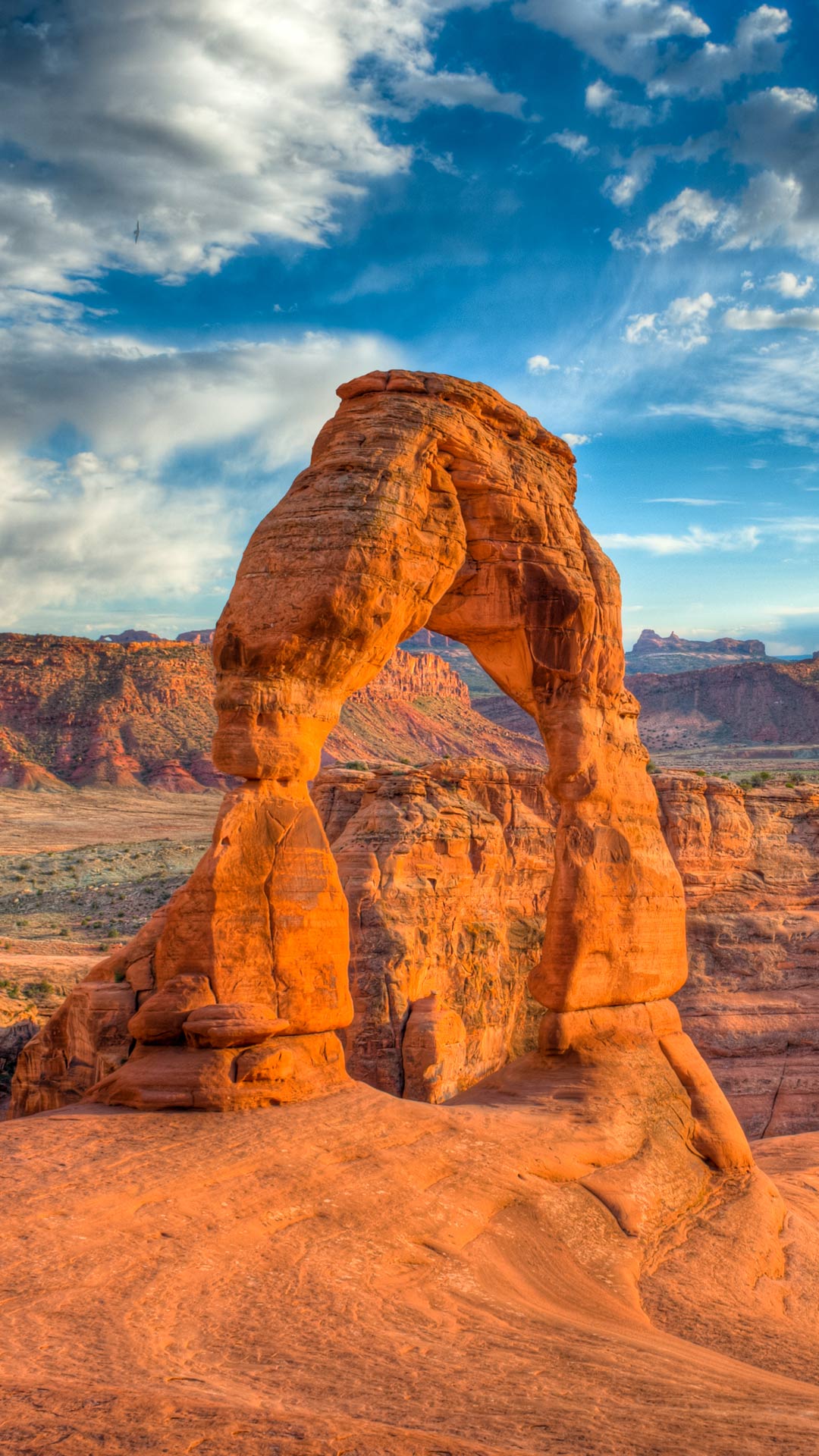 中でも「デリケート・アーチ」は、この地を象徴する存在です。その優雅な曲線はユタ州のナンバープレートに描かれ、ユタ州 100 周年記念切手にも採用されました。アーチにたどり着くには、ウォルフ・ランチという小屋から約 2.4km のトレイルを歩く必要がありますが、荒野を越えて突如現れるその姿は、訪れる人々の心に深く刻まれます。