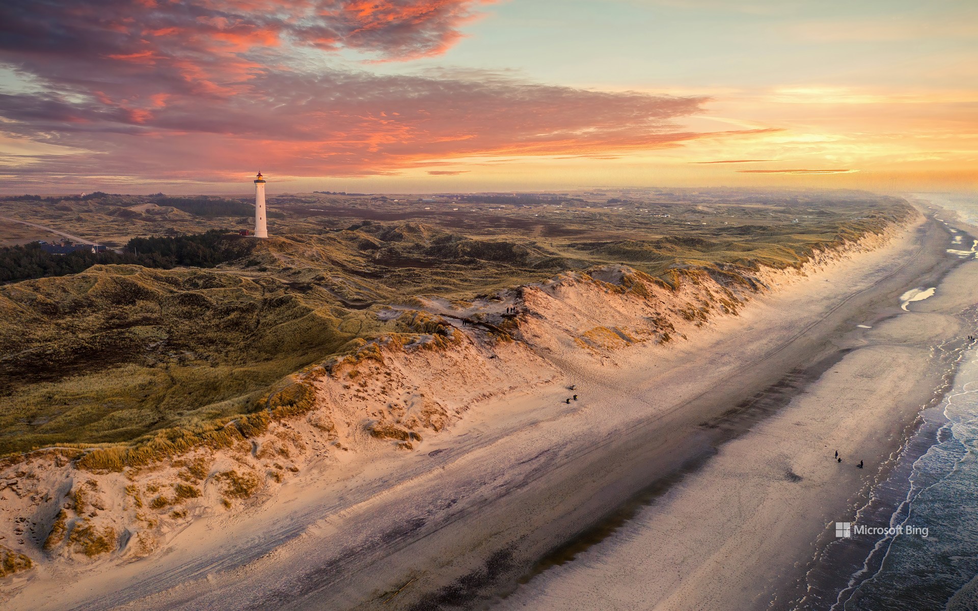 画像のリングヴィグ灯台は町の象徴的な存在です。1906 年に建設され、高さは約 37m あります。灯台の眼前には、雄大な砂浜と果てしなく続く海岸線が広がっており、サーフィンやカイトサーフィン、スタンドアップパドルなどのウォータースポーツが盛んです。