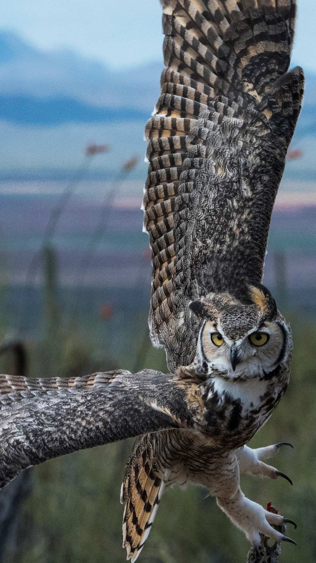 Descubra a majestosa coruja de chifre grande, uma fascinante espécie nativa das Américas! Com "chifres" formados por penas, essa ave noturna também é conhecida como "tigre do ar" devido à sua imponência. Com garras poderosas, essa coruja aplica uma força impressionante, cerca de 136 kg, um poder comparável ao de uma prensa. Dotada de uma visão noturna excepcional, ela gira a cabeça em até 270 graus para ter uma visão completa do ambiente, já que seus olhos são fixos.