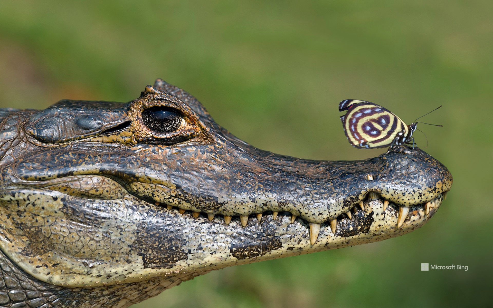 Com olhos atentos, o jacaré é o símbolo da tranquilidade selvagem do Pantanal. No dia 12 de novembro, celebramos o Dia do Pantanal, uma data dedicada à maior planície alagável do mundo e à sua impressionante biodiversidade. Entre seus habitantes mais icônicos está o jacaré-do-pantanal, retratado na imagem com uma borboleta repousando suavemente sobre seu focinho — uma cena que revela o equilíbrio e a beleza da vida selvagem.