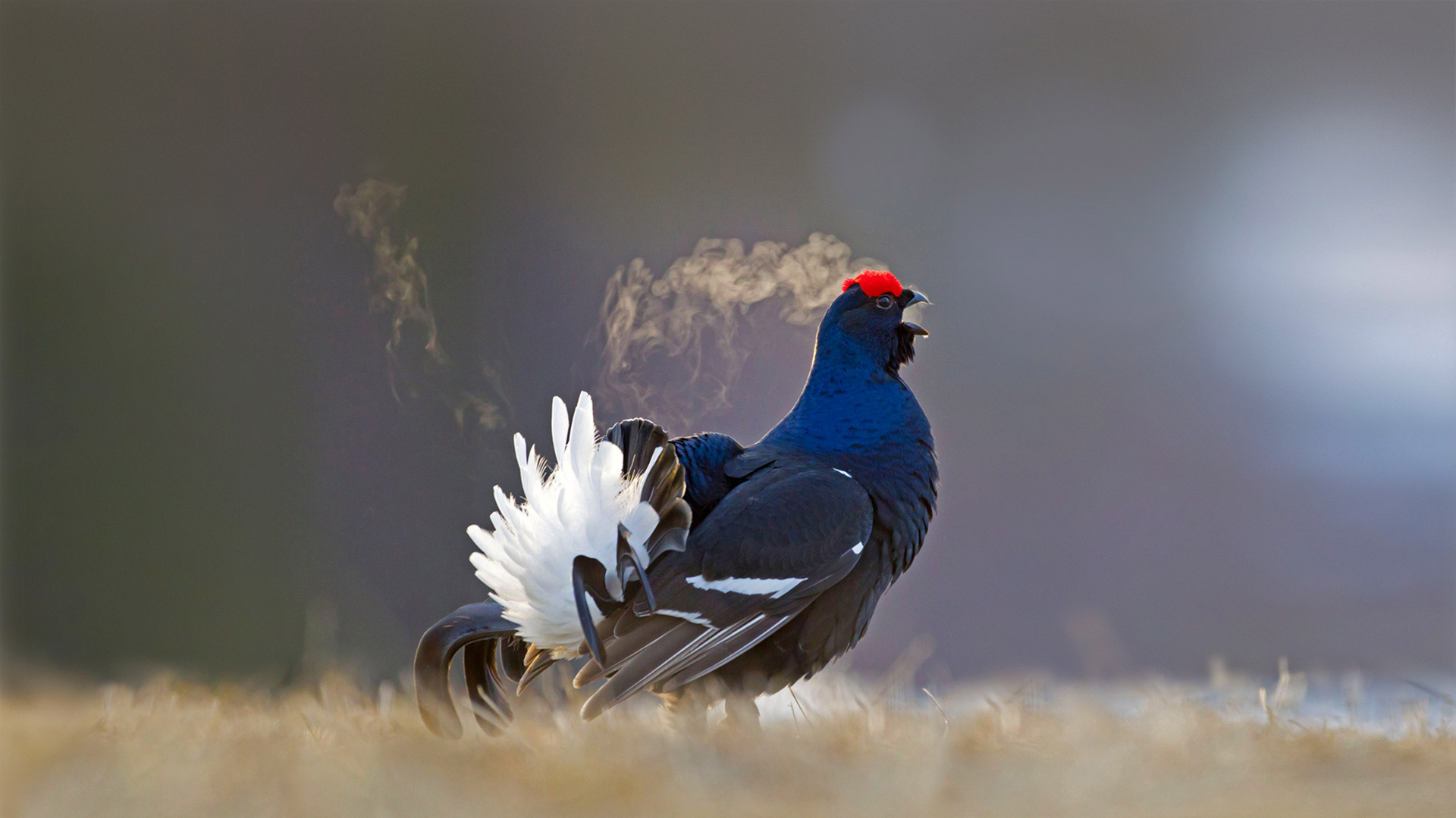 正在打鸣求偶的雄性黑琴鸡,芬兰库萨莫