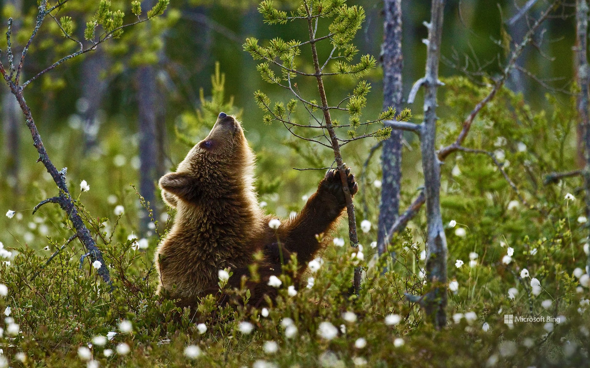 北方针叶林中的欧洲棕熊幼崽,芬兰