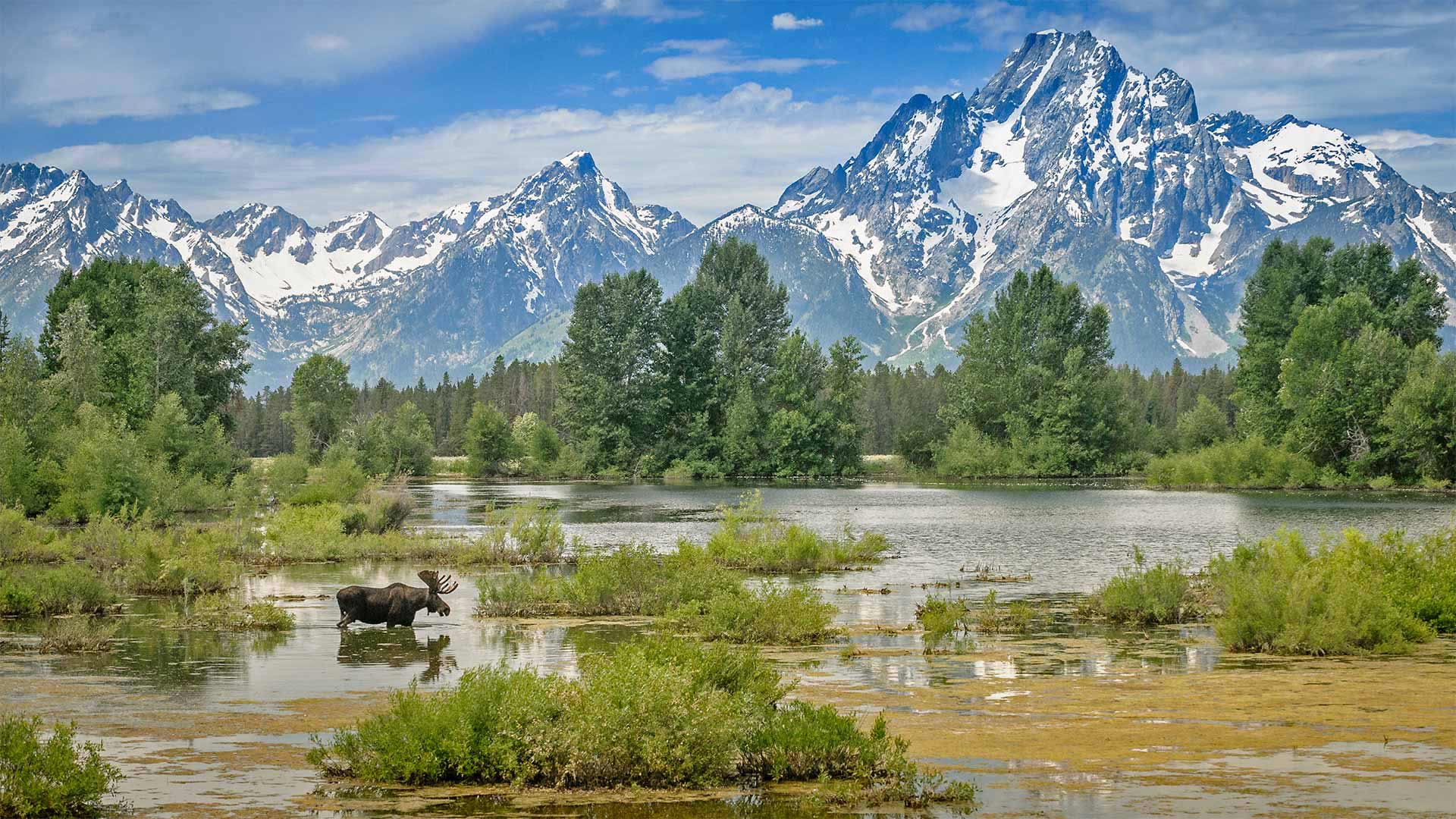 驼鹿穿过莫兰山下的池塘,怀俄明州大提顿国家公园 (© Jim Stamates/Minden Pictures)