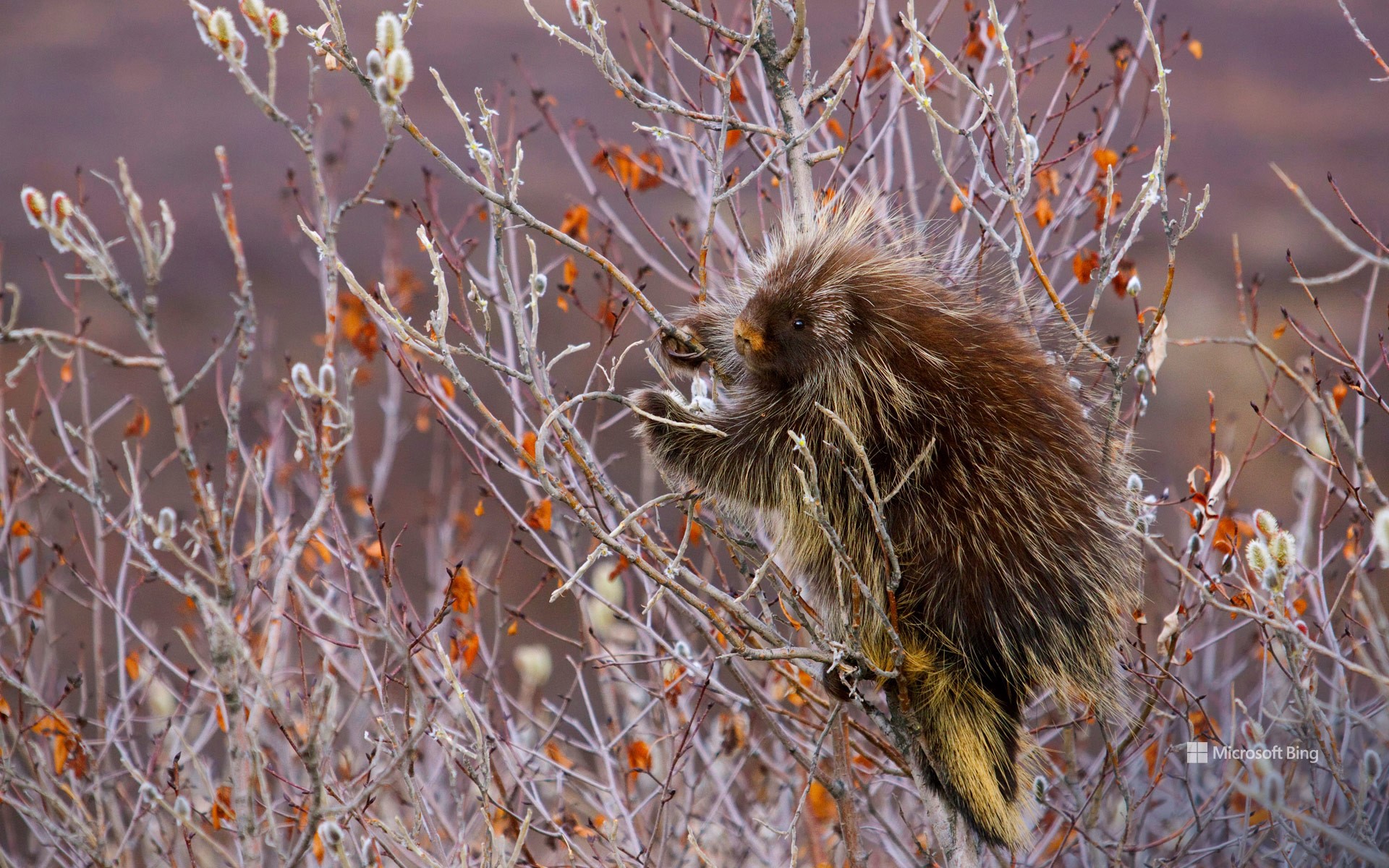 爬上柳树枝头的豪猪,美国阿拉斯加