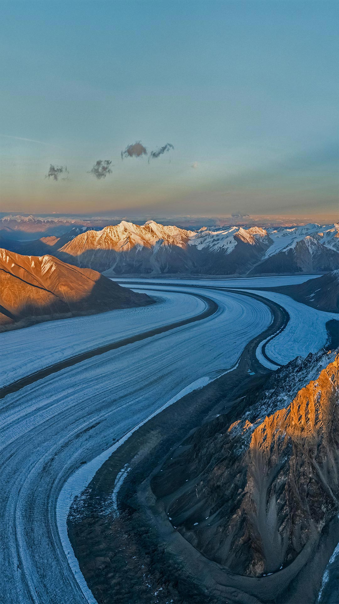 我们现在看到的是Kaskawulsh冰川,这是圣伊莱亚斯山脉的一个大型山谷冰川,位于加拿大育空地区的克卢恩国家公园和保护区内。育空地区的这个角落是地球上除两极以外最大的冰原,2000多条冰川缓慢而稳定地流动,不断地雕刻着山峰之间的巨大峡谷。
