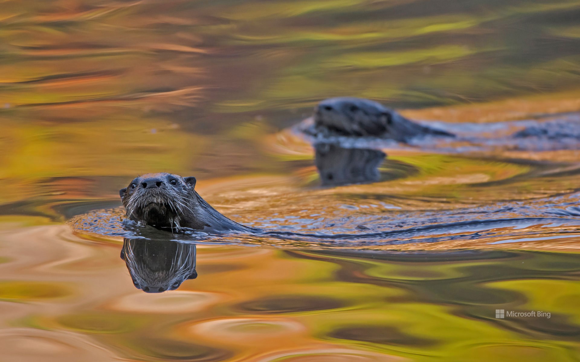 今天照片里的是两只北美水獭,拍摄于阿卡迪亚国家公园。严格来说,这些别名“水狗”的水獭是黄鼠狼家族的成员。它们不只出现在河里,还遍布北美的水道和海岸。水獭眼睛近视,视力适合辅助游泳,因此它们有时会冲向人类或船只,可能并非故意,只是没看见。