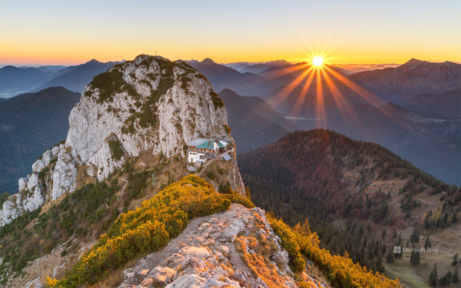 今天的照片是德国巴伐利亚的泰根塞山脉。这张照片展示了从Roßstein山(1698米)望向Buchstein山(1701米)的风景。两座山峰形成一个马鞍的形状,在马鞍中间是一座山间小屋。这座小屋于5月中旬至11月初开放,为徒步者和登山者提供食宿。由于其位置特殊,它常常被称为“鹰巢”。