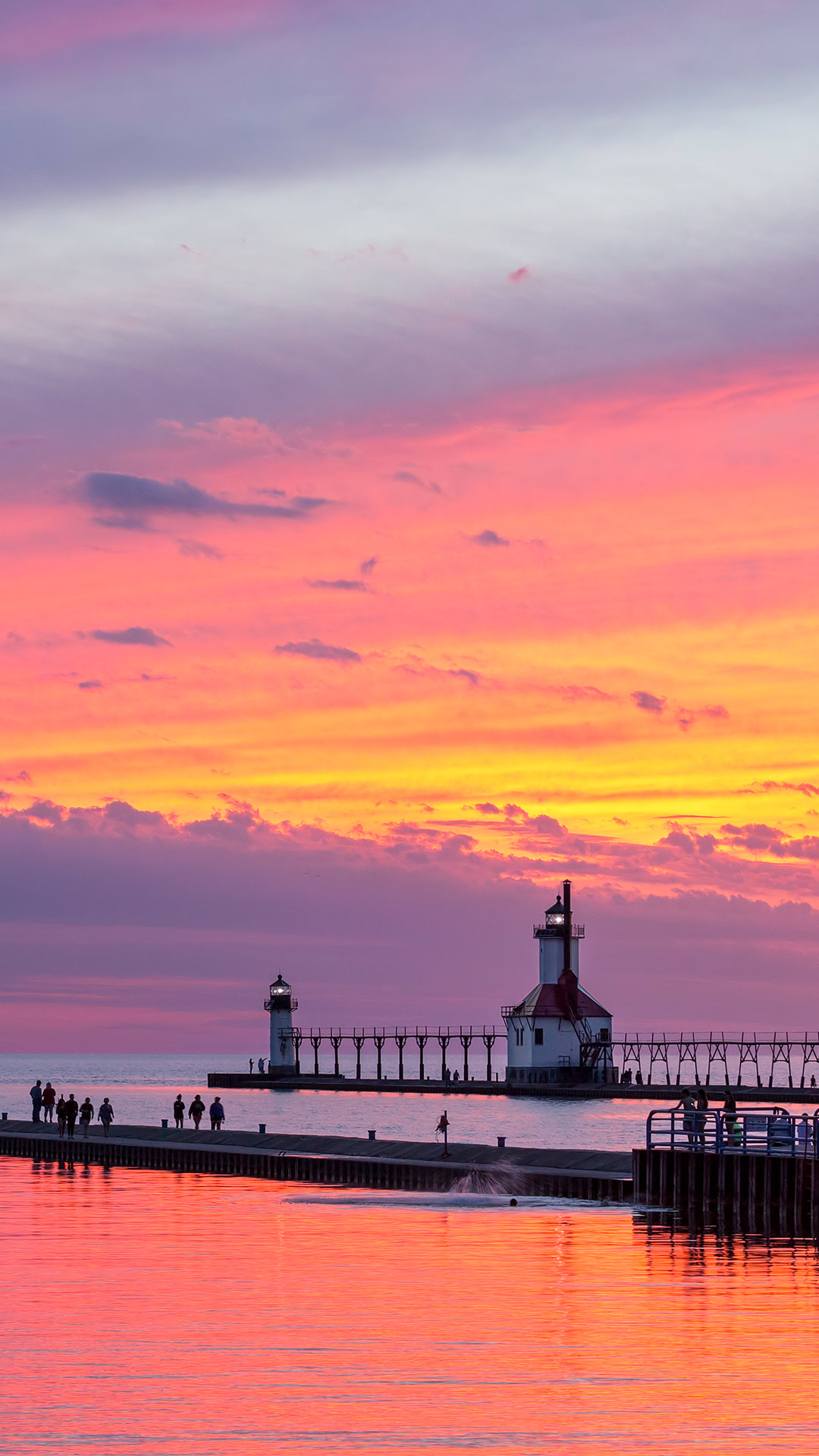 昏暗的黄昏中,灯塔点亮了密歇根湖与圣约瑟夫河的交汇处。19世纪,密歇根湖上修建了两座码头,它们分别位于圣约瑟夫河河口的两侧,以帮助保护上游航行的船只。到了20世纪初,每个码头的尽头都修建了一座灯塔。如图所示,它们便是圣约瑟夫北码头内灯和外灯。2005年,这些码头尽头的灯塔被添加到美国国家历史遗迹名录中。