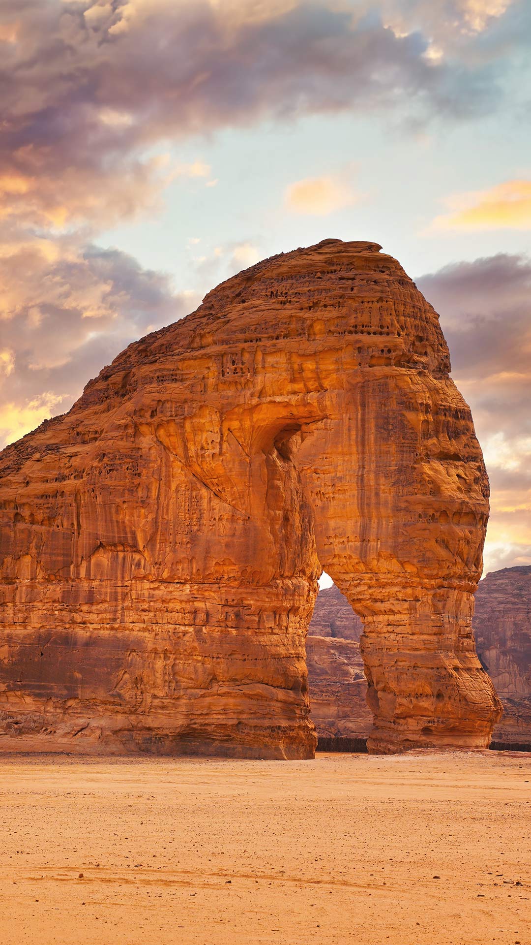 Ist es nicht erstaunlich, was die Zeit schafft? Im Laufe von Jahrmillionen hat die Natur diese schillernde Sandsteinformation geformt, die als Elephant Rock bekannt ist. Durch die Erosion von Wind und Wasser hat der 52 Meter hohe Felsen in der Nähe der Stadt Al-ʿUla in Saudi-Arabien die Form eines Elefanten angenommen. Heute ist er ein markantes Wahrzeichen der Region. Wenn die Sonne untergeht, wirft sie ein warmes Licht auf den rot gefärbten Elefanten und den goldenen Sand der umliegenden Wüste.