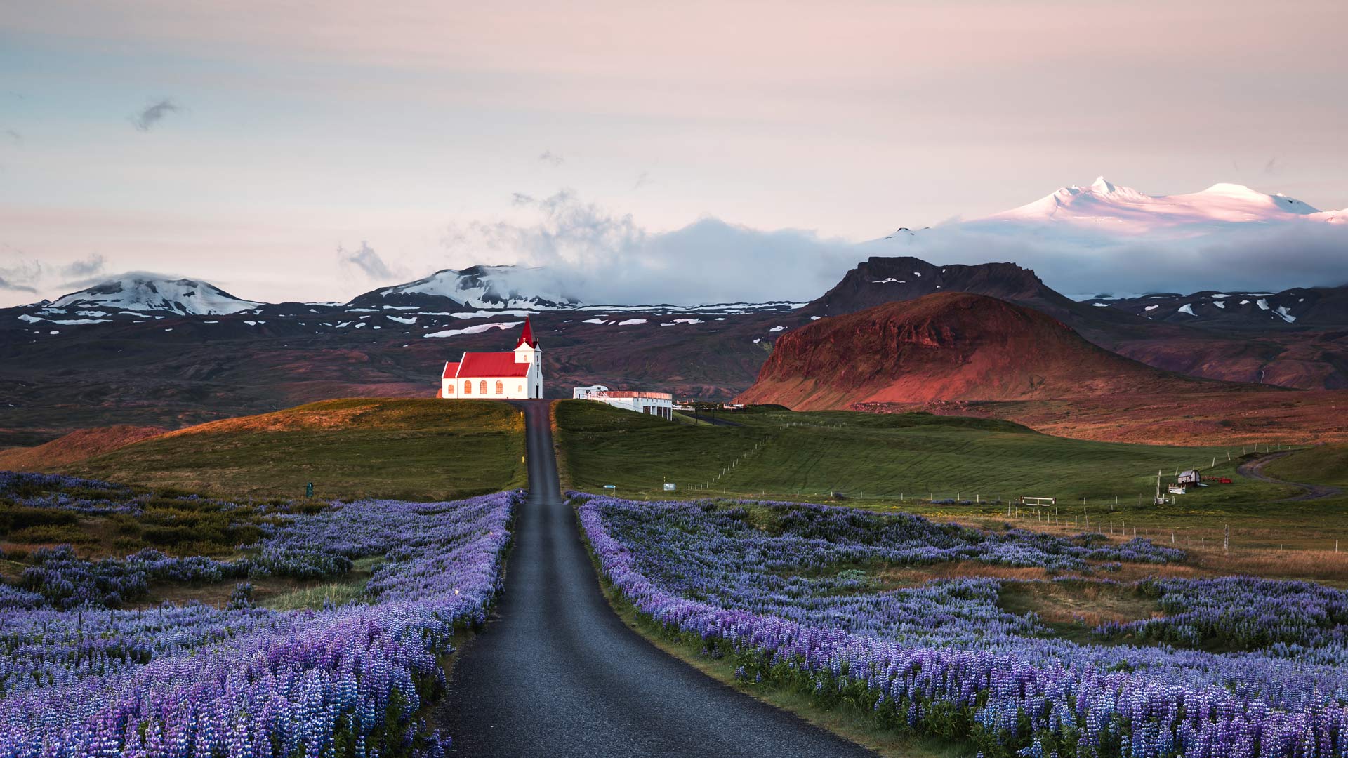 Lupinenfelder und Kirche bei Sonnenaufgang, Snæfellsnes-Halbinsel, Island (© Matteo Colombo/Getty Images)
