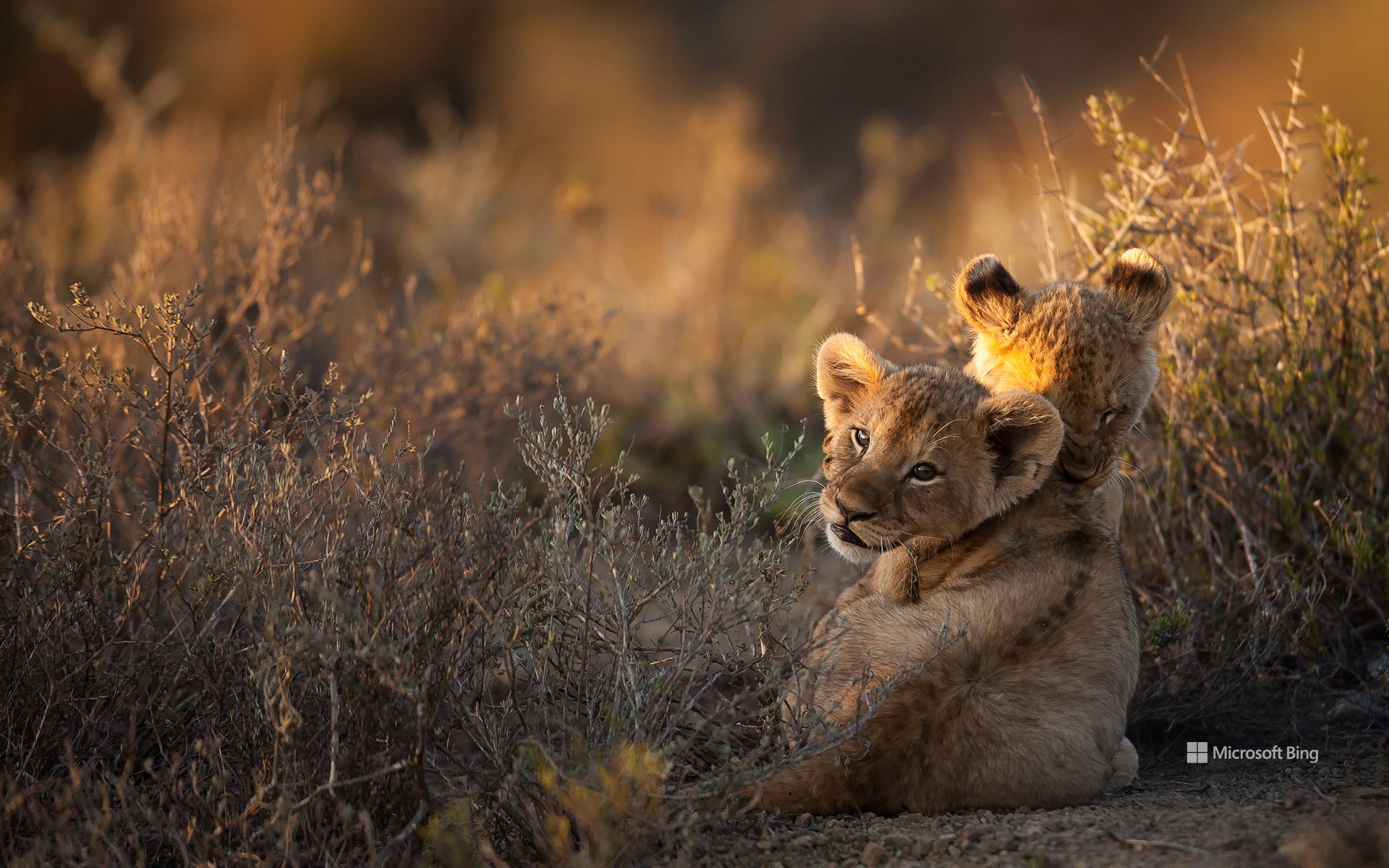 Zwei Löwenjunge bei Sonnenaufgang, Südafrika (© Ruan Springorum/Getty Images)