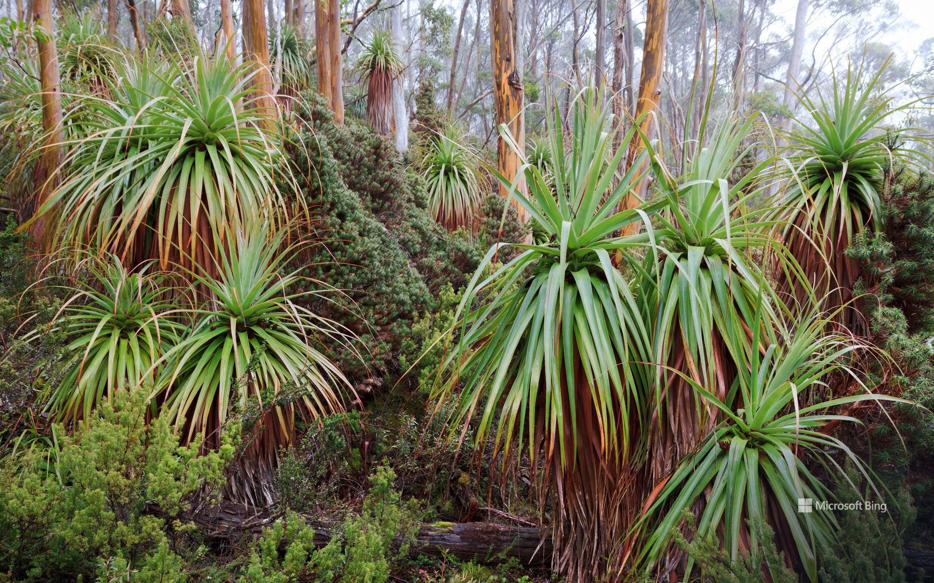 Tasmanischer Schnee-Eukalyptus und Pandani-Pflanzen in der Nähe des Lake Dobson, Mount-Field-Nationalpark, Tasmanien, Australien (© Whitworth Images/Getty Images)