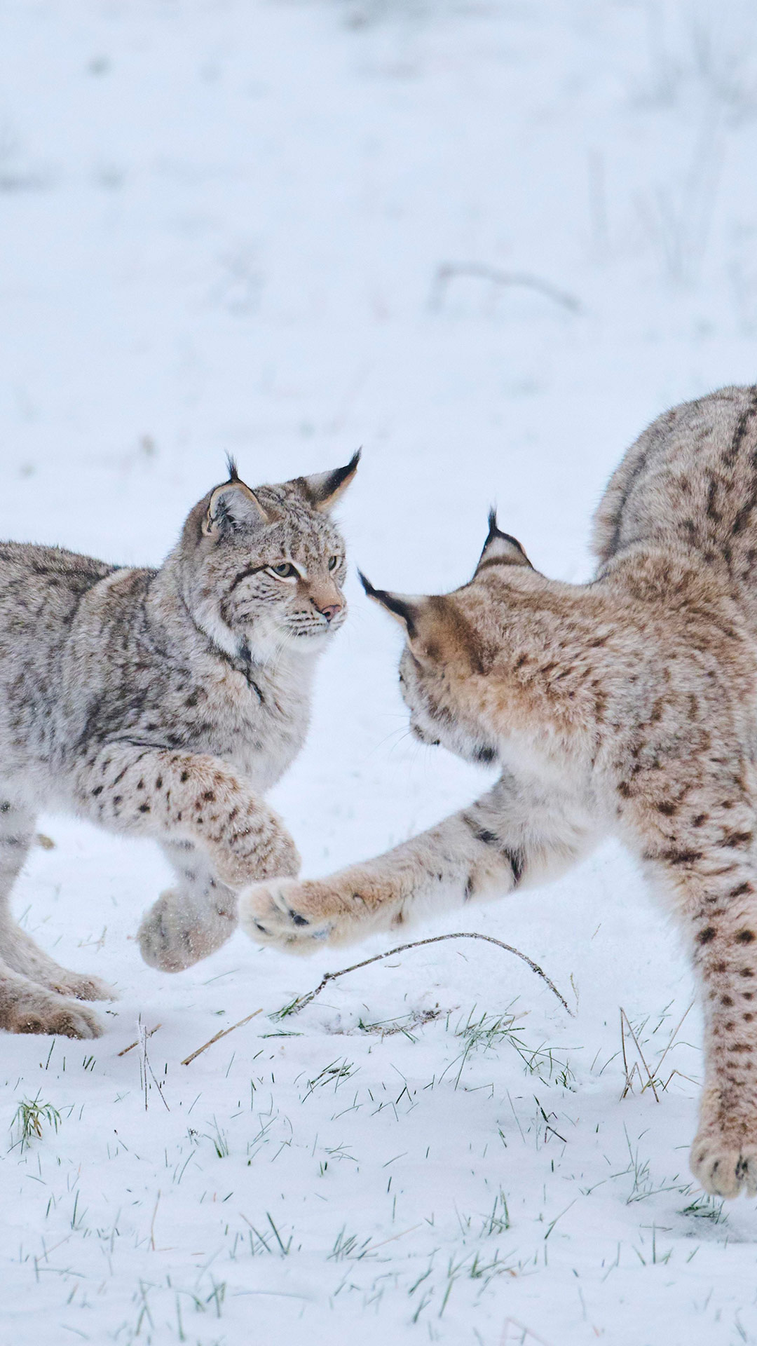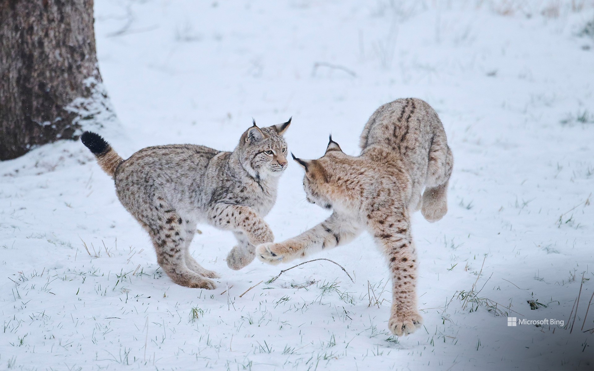 Zwei junge Eurasische Luchse tollen durch den frischen Schnee – ein Anblick, der selbst in den stillen Wäldern Bayerns selten geworden ist und den das heutige Bild eindrucksvoll festhält. Mit ihrem dichten, gefleckten Winterfell sind die beiden perfekt an die kalte Jahreszeit angepasst. Auffällig sind die schwarzen Pinsel an den Ohren, die vor allem der Kommunikation dienen und den Tieren ihren charakteristischen Ausdruck verleihen. Luchse gehören zu den größten Wildkatzen Europas. Ausgewachsene Tiere erreichen eine Schulterhöhe von 55 bis 70 Zentimetern und wiegen je nach Geschlecht meist 18 bis 30 Kilogramm.