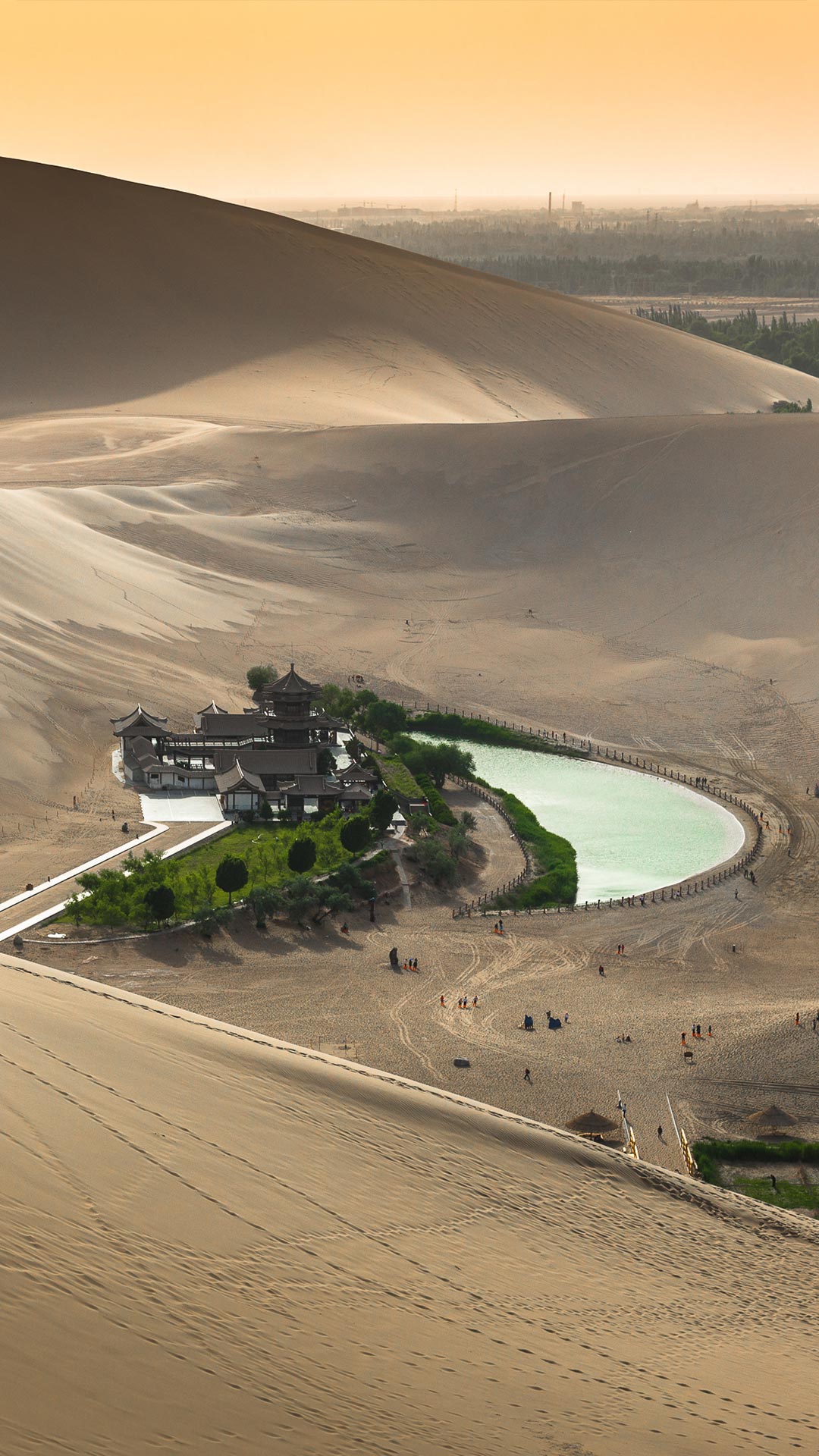 Located near Dunhuang, Gansu Province, China, Crescent Lake is a captivating natural wonder hidden in the vast Gobi Desert. This oasis, known for its unique crescent shape, has served as a vital water source for centuries. The lake is thought to have formed in a valley carved by wind and to be fed by an underground spring. Nearby mountains protect it from being smothered by the region's blowing sands. Conservation efforts have succeeded in making sure the lake doesn't go dry, preserving it in the ecosystem and as a tourist destination. Visitors can enjoy activities such as boating on the lake, camel rides through the surrounding sand dunes, and ancient Buddhist art and murals in the nearby Mogao Caves.