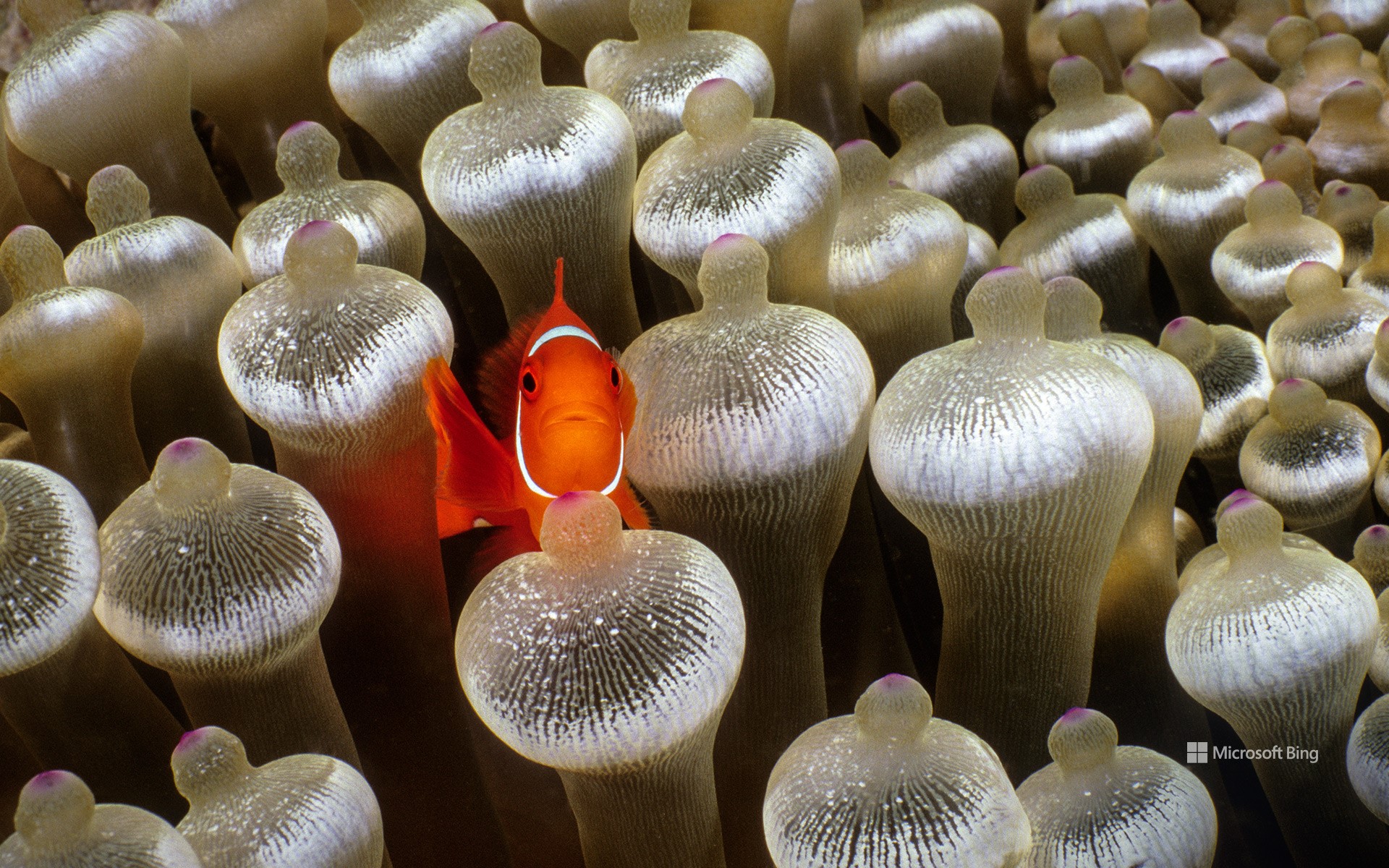 Spine-cheeked anemonefish surrounded by bubble-tip anemone, Milne Bay, Papua New Guinea (© Fred Bavendam/Nature Picture Library)