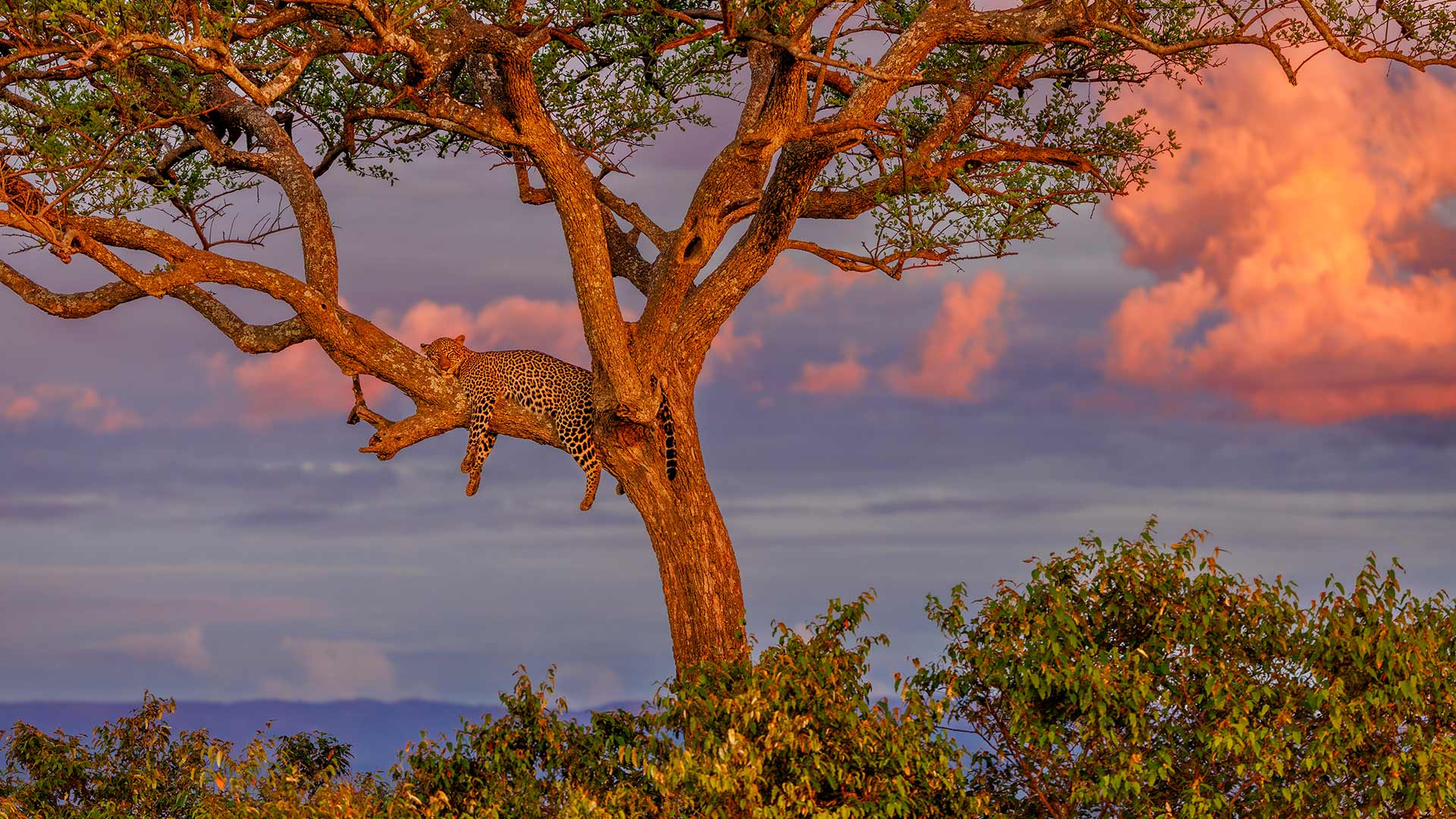 Leopard sleeping in a tree in the savannah, Masai Mara National Reserve, Kenya (© Klein & Hubert/Nature Picture Library)