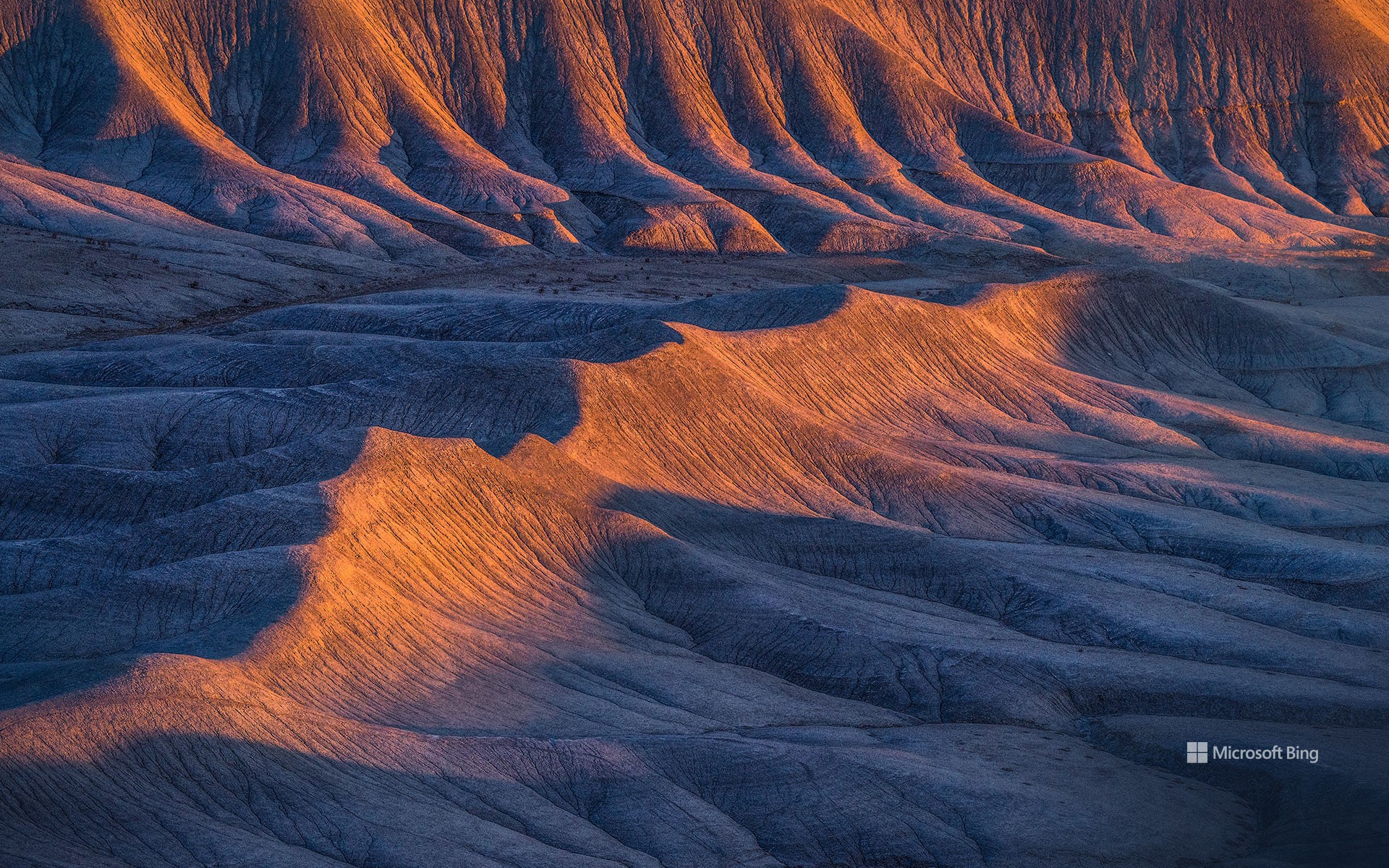 Wavy sandstone ridges stretch across the Caineville Badlands, Utah, resembling nature's brushstrokes on stone. These formations are made of fine-grained sediment that settled in ancient river deltas and inland seas and later hardened into stone. Over time, erosion carved through the layers, exposing flowing, ripple-like patterns. The sedimentary layers tell a story of shifting climates and ancient landscapes. The barren land, seen in today's image, may appear lifeless, but during early spring, rainfall blankets the terrain with tiny purple and yellow flowers. Light and shadow shift throughout the day, offering photographers and visitors various angles. While much of the terrain remains rugged, some areas offer easy access, allowing visitors to explore without strenuous hiking.