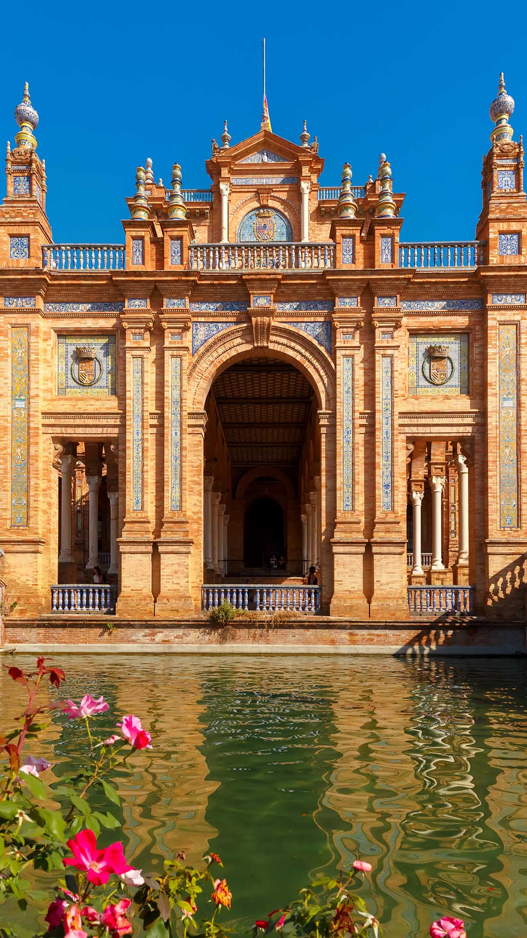 Admiremos la belleza de la Plaza de España en Sevilla, corazón de Andalucía, declarada bien de interés cultural, con su majestuosidad semicircular, sus torres que rozan el cielo y rodeada por un canal cruzado por puentes.