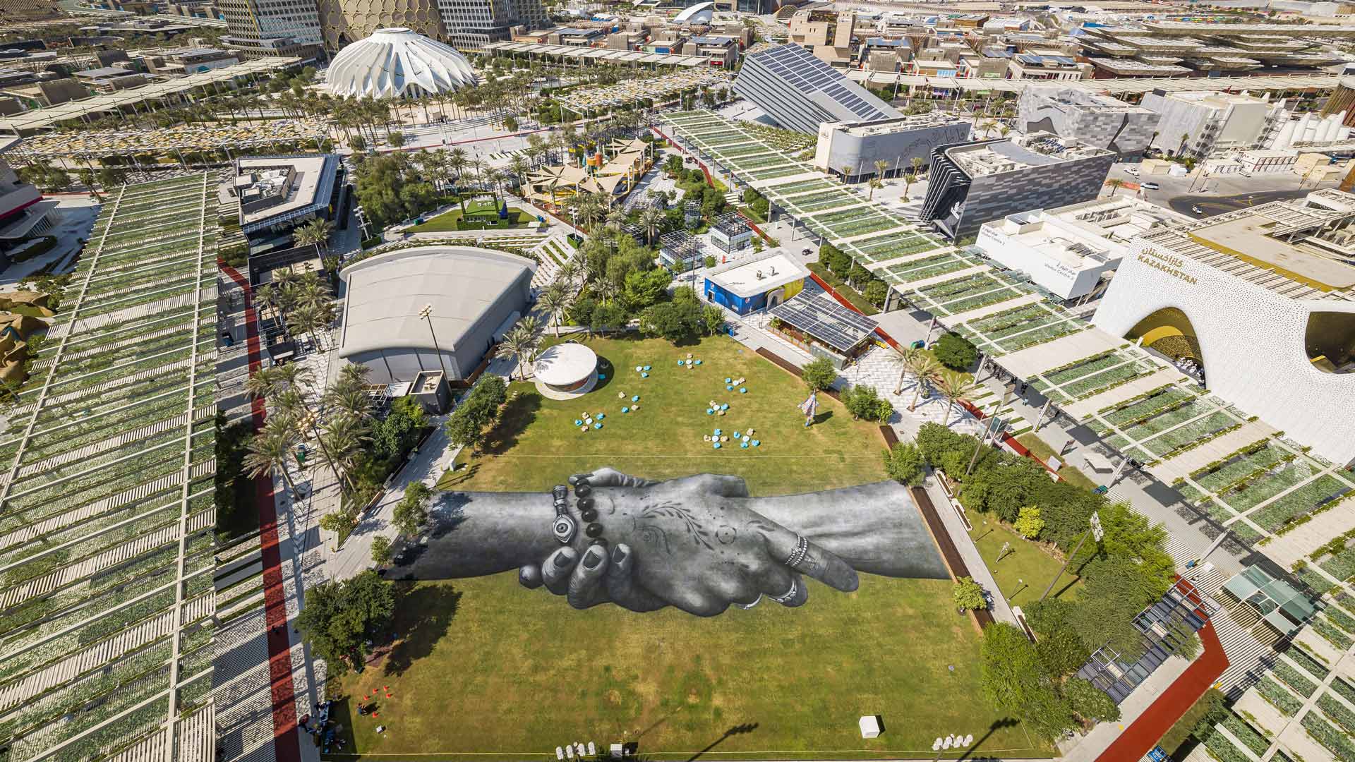 El artista suizo Saype lo representa en Beyond Walls, una serie de murales de land art con manos gigantes unidas, pintadas con pigmentos biodegradables. Estas obras, presentes en más de 30 ciudades del mundo, simbolizan la solidaridad entre culturas. Uno de los murales más impresionantes se presentó en la Expo 2020 de Dubái y solo podía apreciarse desde el aire.