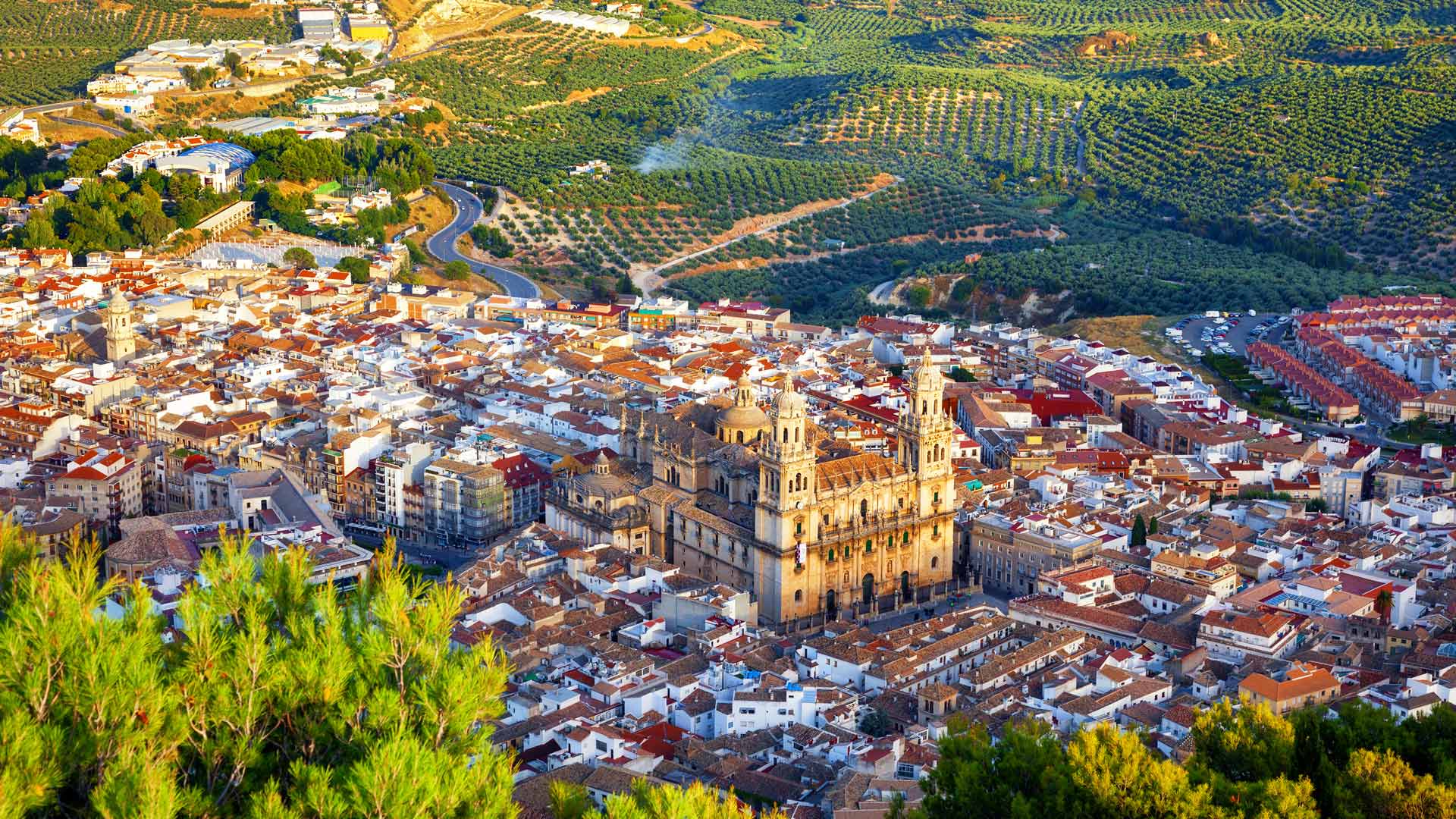 Jaén, rodeada por un manto de más de 66 millones de olivos, es la capital mundial del aceite de oliva. Desde esta impresionante vista aérea, podemos apreciar cómo el paisaje se dibuja con infinitas hileras de árboles que han marcado la historia, la economía y la cultura de esta tierra. La Catedral de la Asunción, joya renacentista declarada Patrimonio de la Humanidad por la UNESCO, domina el horizonte y recuerda la grandeza del pasado de la ciudad.