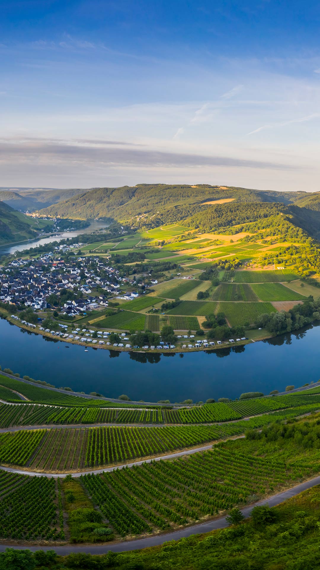 La Moselle est un affluent du Rhin. Elle traverse les plus beaux paysages d’Europe en serpentant à travers la France, le Luxembourg et l’Allemagne. En chemin, elle creuse des vallées d’une beauté naturelle à couper le souffle, parsemées de villes et de monuments historiques. Des vignobles luxuriants baignés de soleil s’accrochent aux pentes abruptes surplombant la rivière, produisant des vins célèbres dans le monde entier, comme le riesling, le pinot blanc et le pinot gris, pour n’en citer que quelques-uns.