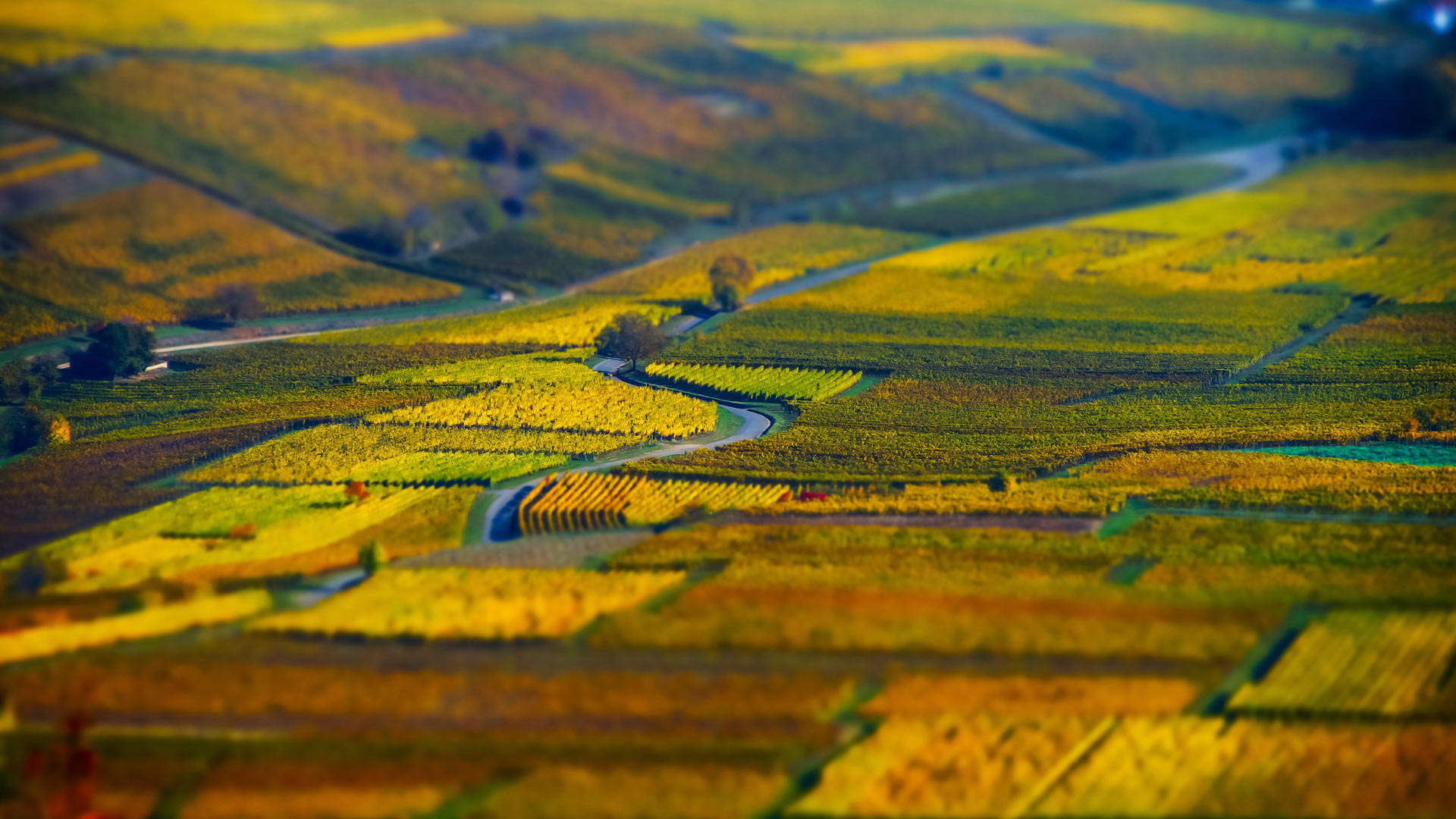 Vue aérienne de champs géométriques de raisin, vignoble en Alsace (© Alexander Sorokopud/Alamy Stock Photo)